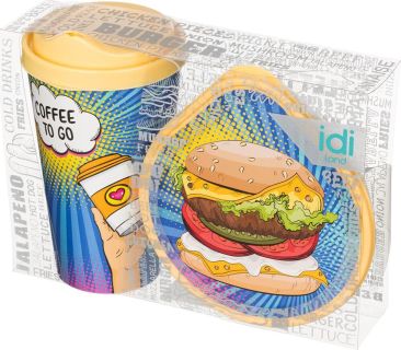 Набор посуды HOMVER IZI-GO стакан с крышкой 550мл с декором + контейнер для хранения 0,4л с декором(бл.-желтый) 222101904/01
