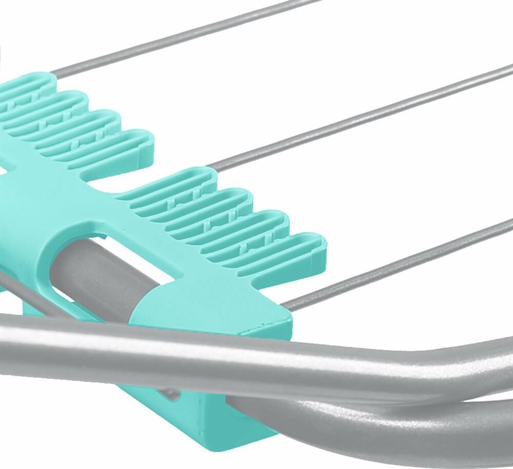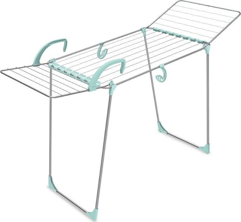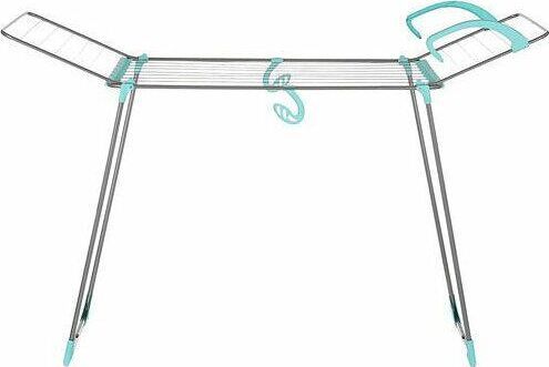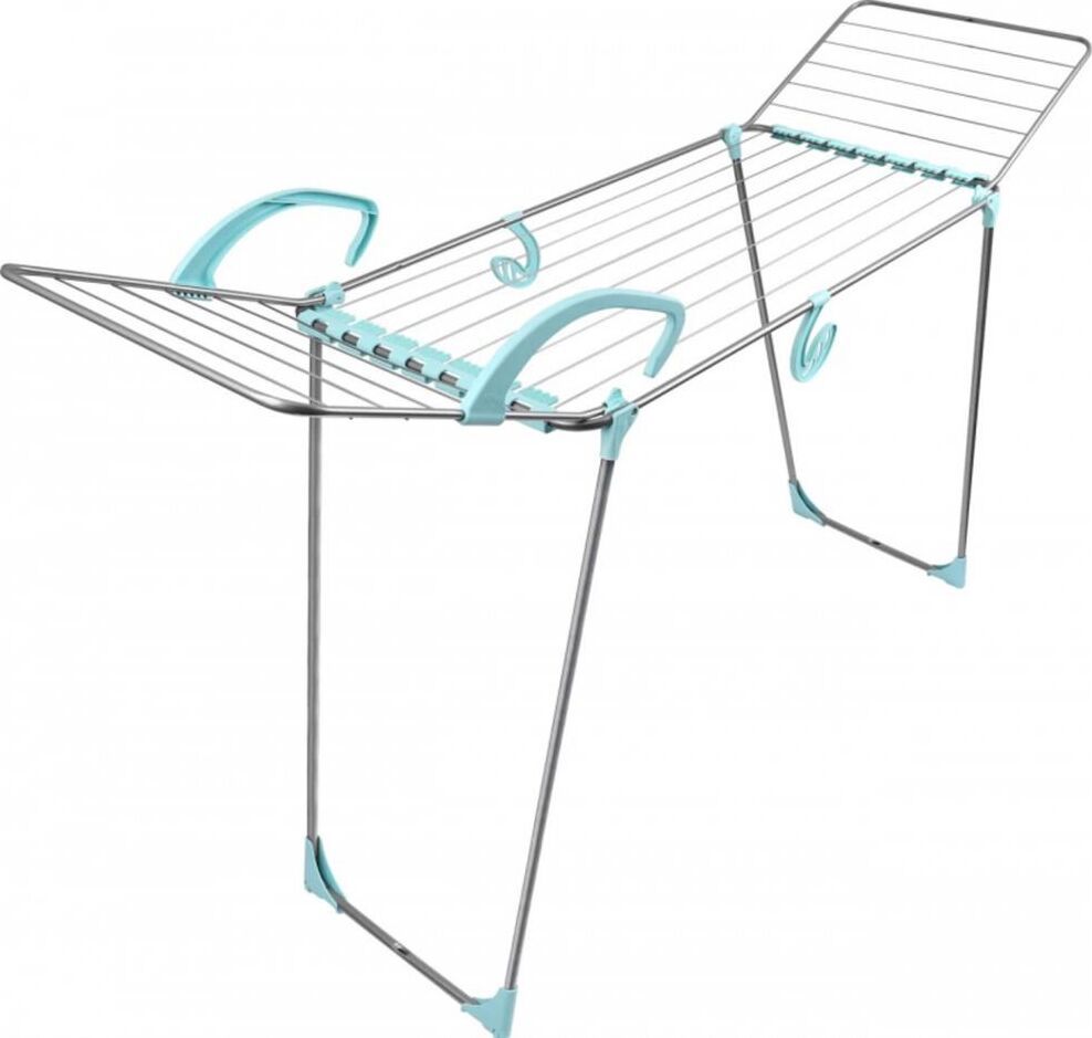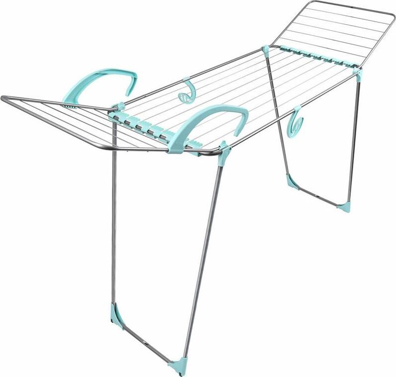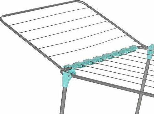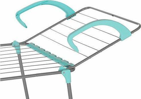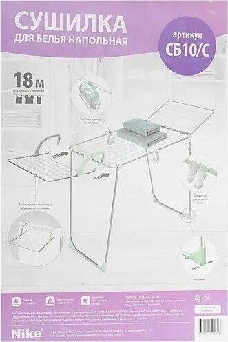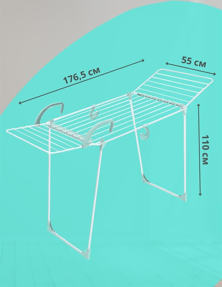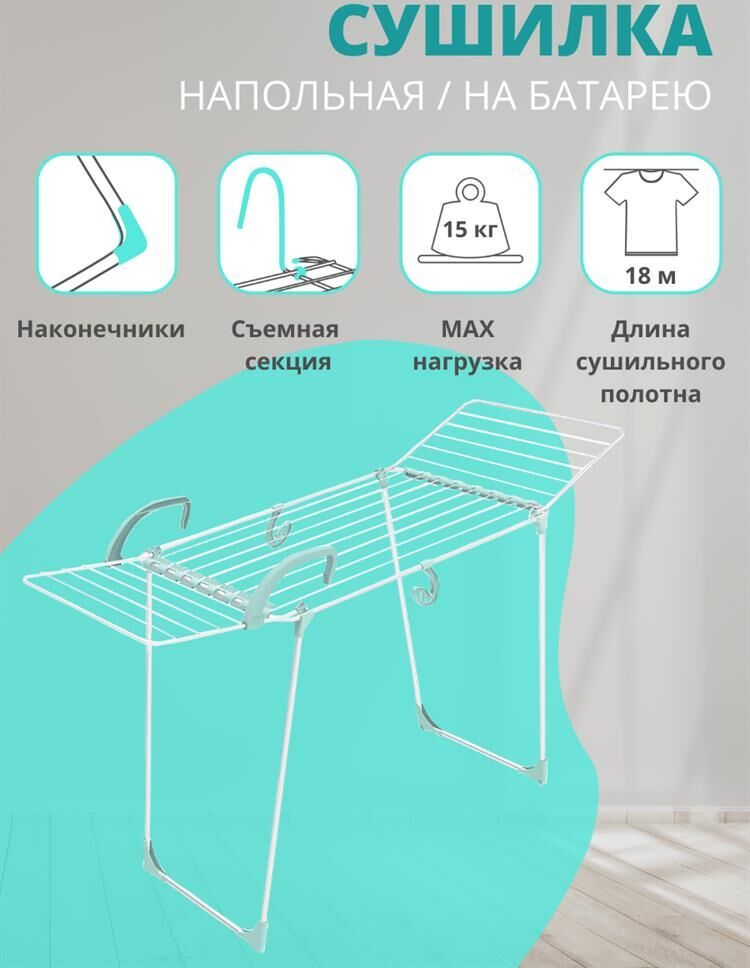 (ДхШхВ)75х55х110см в разложенном виде.Съемная боковая секция, которую можно использовать как сушилку на радиатор для ускорения сушки ли как сушилку на ванну.Две линейки держателей для мелкого белья.Удобные крючки для сушки обуви.Колесики для удобного перемещения в помещении.Простой механизм складывания.Стальные струны с антикоррозийным покрытием.Пластмассовые наконечники для дополнительной устойчивости и защиты пола от повреждений подходит для использования в любых помещениях и на открытом воздухе Длина сушильного – 18 м.Максимальная нагрузка – 15 кг.Цвет серый.