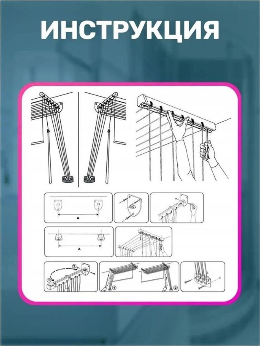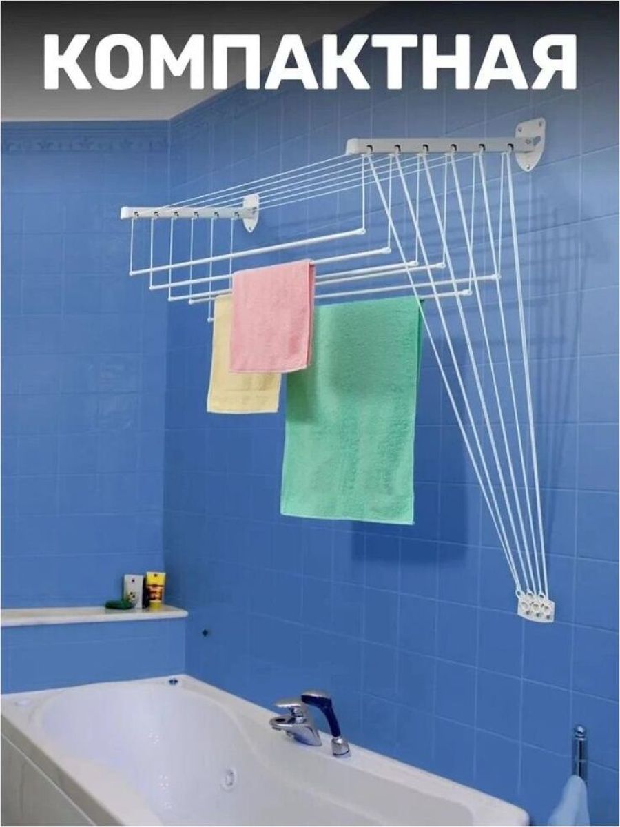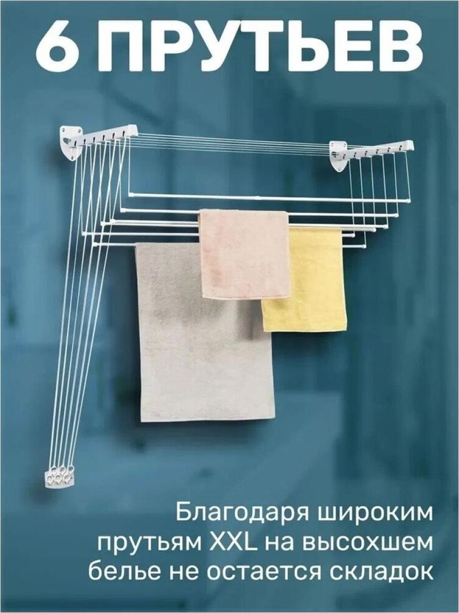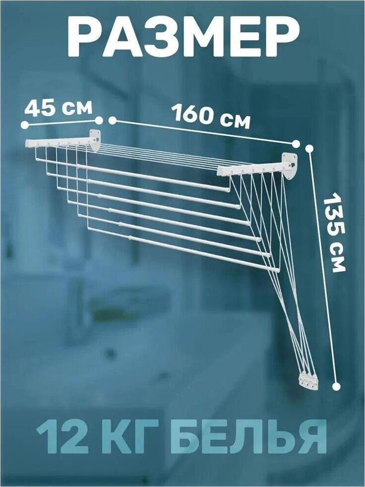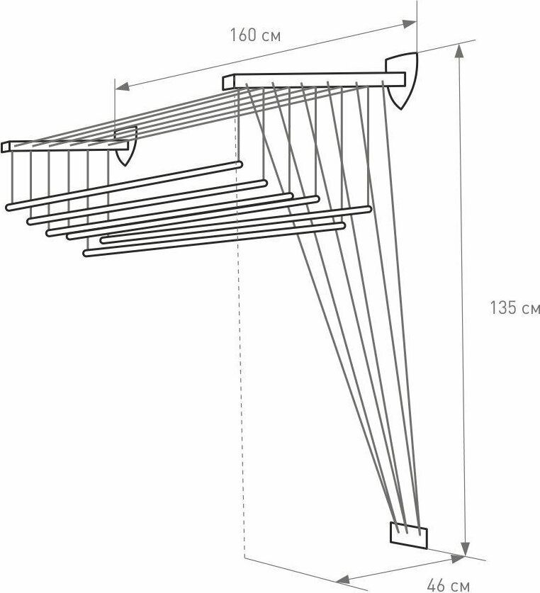 Размер: 160x43x135 см.Материал: cталь, покрытая эпоксидным порошком Крепится сверху на стене.Специальный механизм обеспечивает подъем и опускание направляющих, чтобы облегчить процесс развешивания белья Максимальная нагрузка: 12 кг.