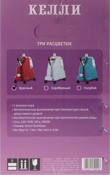 СТАЦИОНАРНЫЙ УТЮГ ОТПАРИВАТЕЛЬ-парогенератор. Напряжение: 220-240 В Два режима мощности: 1300ВТ, 2500ВТ. Номинальный поток пара: 35г/мин; Двеннадцатидисковый латунный нагревательный элемент. Кнопка вкл/выкл. Объём резервуара: 3л. Размер: 410х270х440(мм) Вес 7,0 кг; 6,0 кг Цвет: красный.