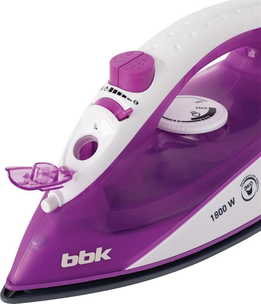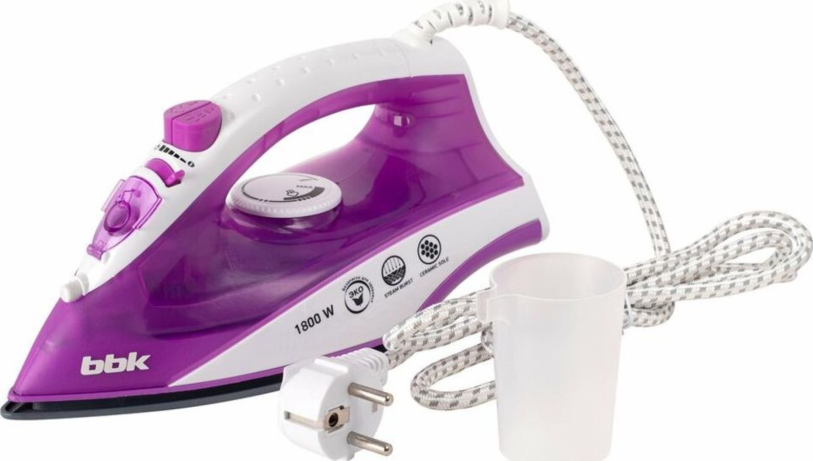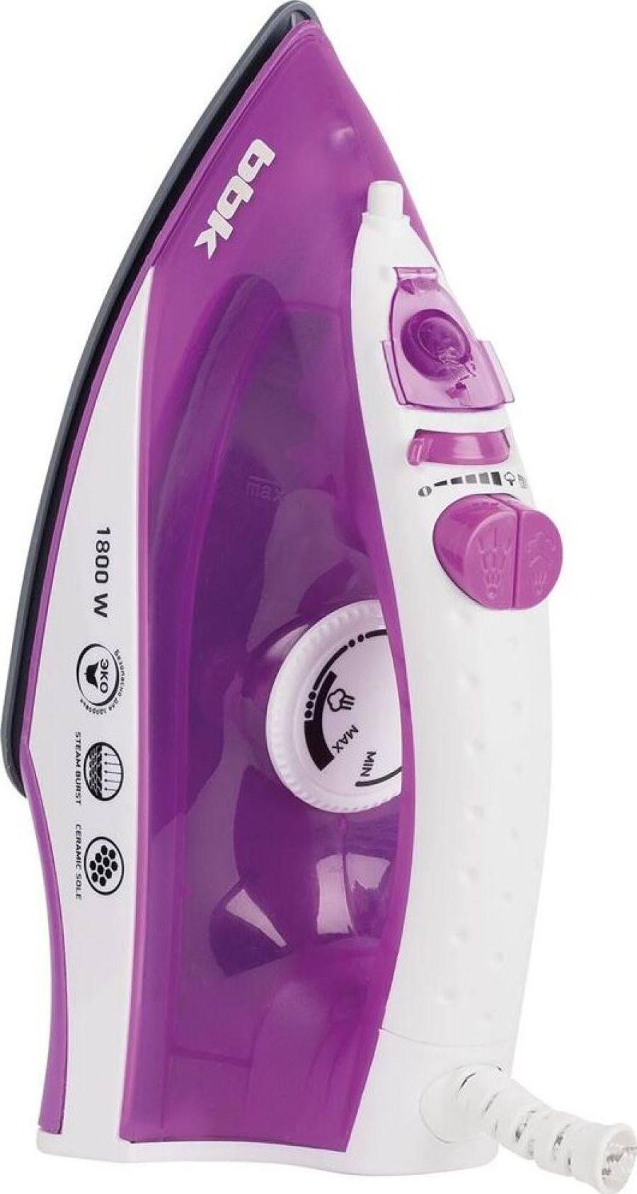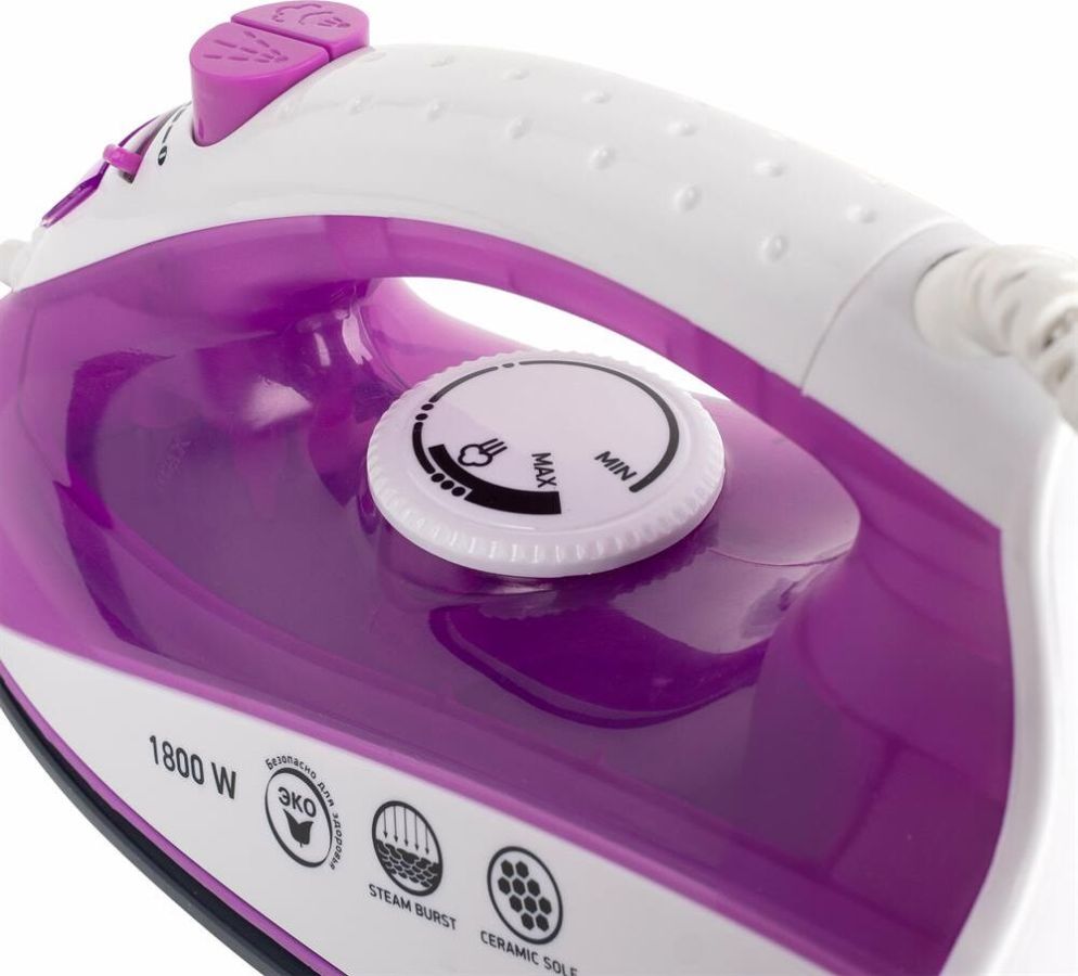Мощность 1800 Вт, керамическое покрытие подошвы, паровой удар, вертикальное отпаривание, плавные регулировки подачи пара и температуры, устройство распыления воды, защита от накипи, длина шнура 1,6 м.