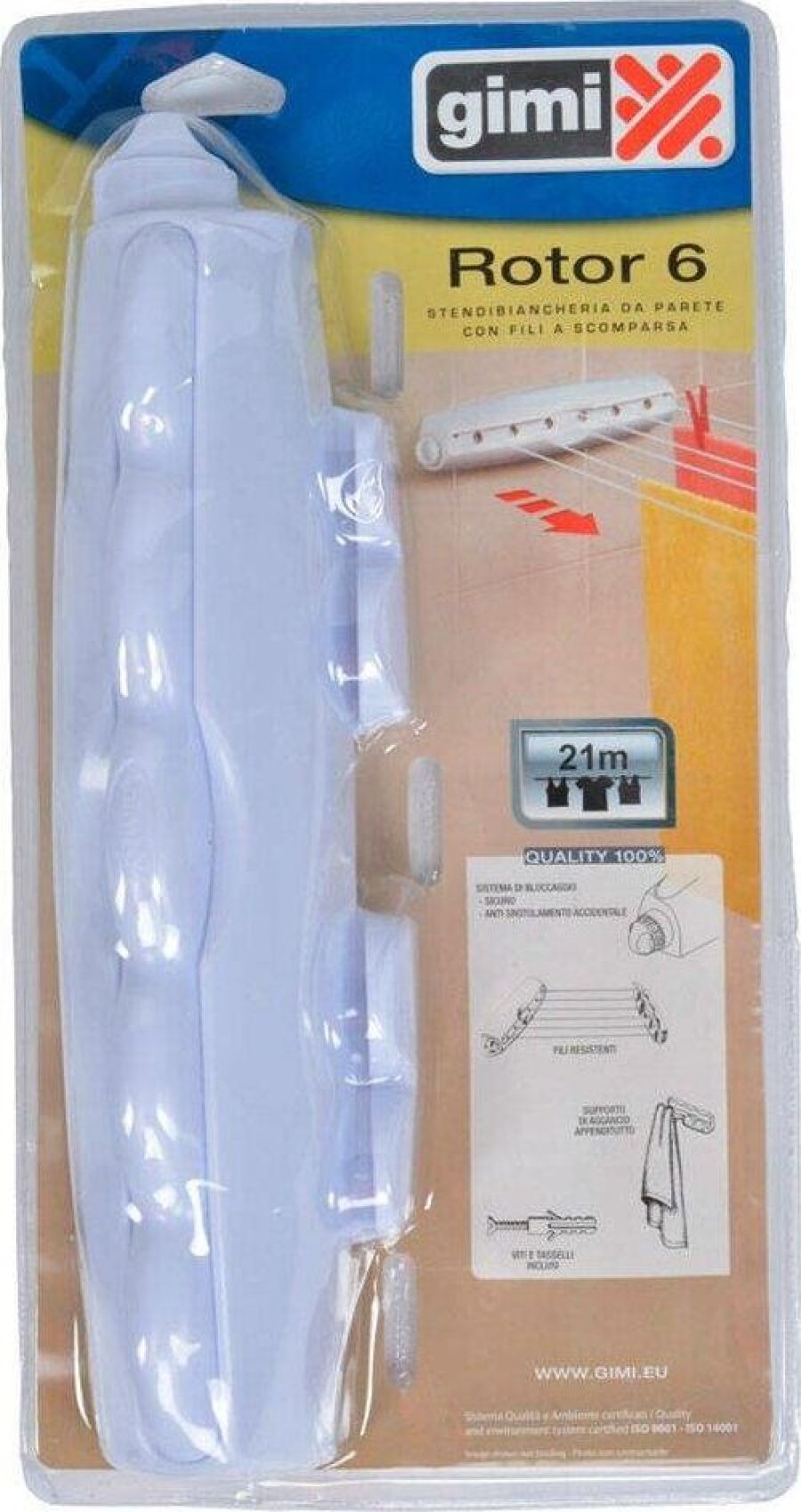 Сушилка для белья Gimi Rotor 6 настенная верёвочная. Рабочая длина для сушки белья 21 м. Высота сушилки 9 см. Ширина сушилки 360 см. Максимальный вес нагрузки 10 кг.