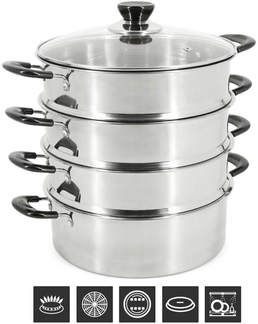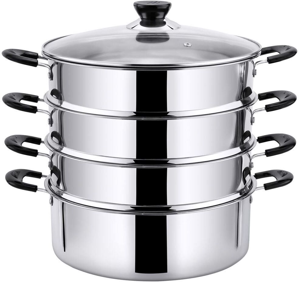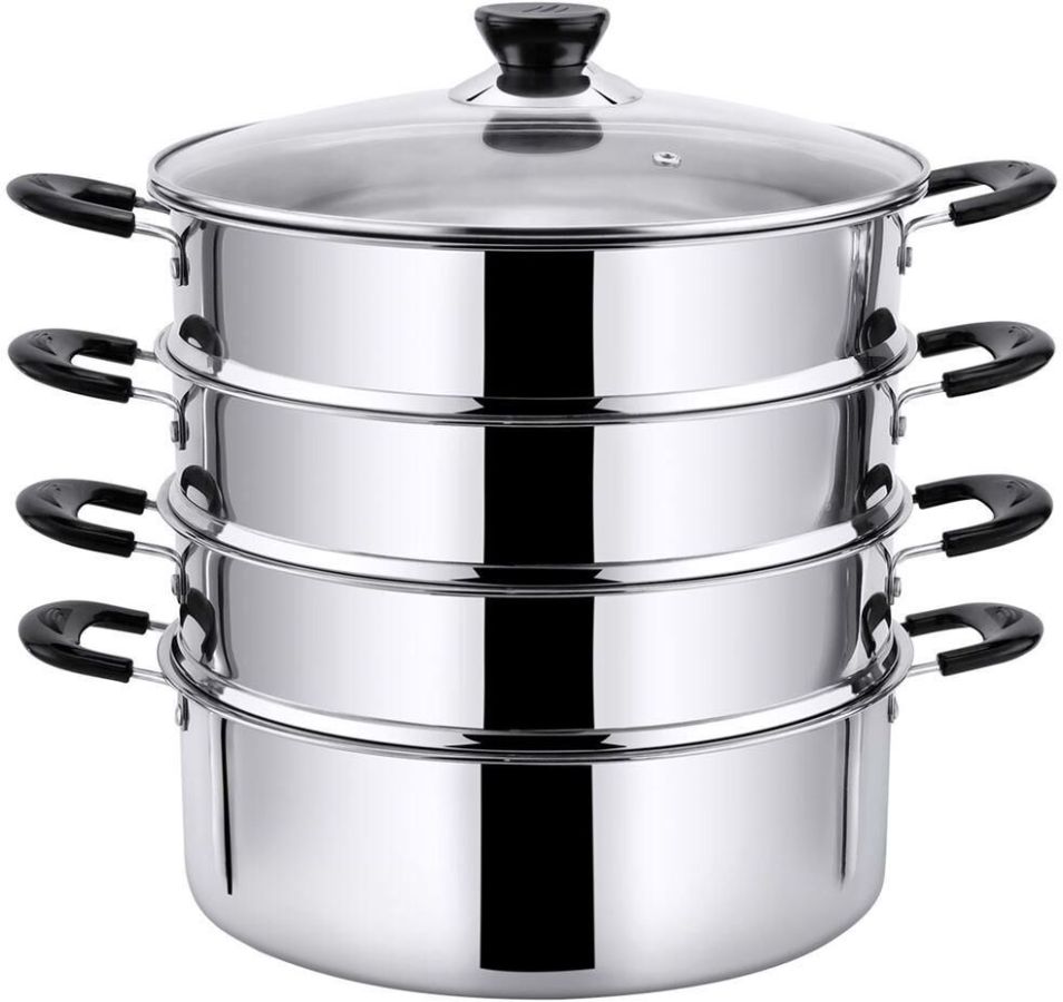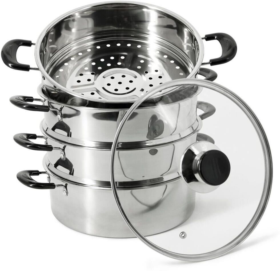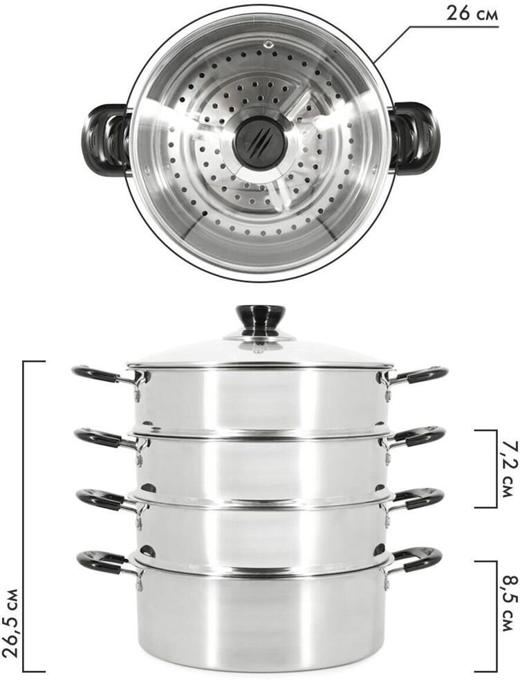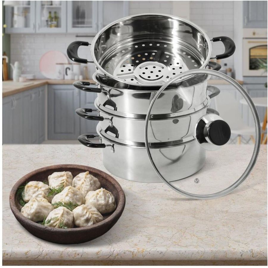 Мантоварка-пароварка Pomi d'Oro P630102 Vapore со стеклянной крышкой. Диаметр 26см. 3 перфорированных яруса, высота 7см. Нижняя часть мантоварки может использоваться как кастрюля, объем 4.7 литра. Изготовлена из высококачественной нержавеющей стали. Безопасна для человека и не выделяет вредных веществ при повышенных температурах. Крышка изготовлена из термостойкого стекла с отверстием для выпуска пара. Не нагревающиеся бакелитовые ручки.