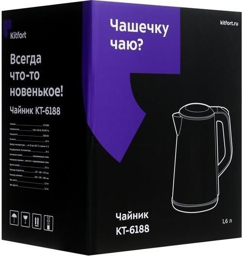 Мощность 1500 Вт. Максимальный объем 1.6 л. Нагревательный элемент скрытый. Индикация включения. Дополнительные функции поддержание температуры, регулировка температуры нагрева Безопасность. автоотключение, защита от включения без воды Конструктивные особенности дисплей, кнопка открытия крышки, подставка 360, фильтр от накипи. Температурные режимы 5 шт.