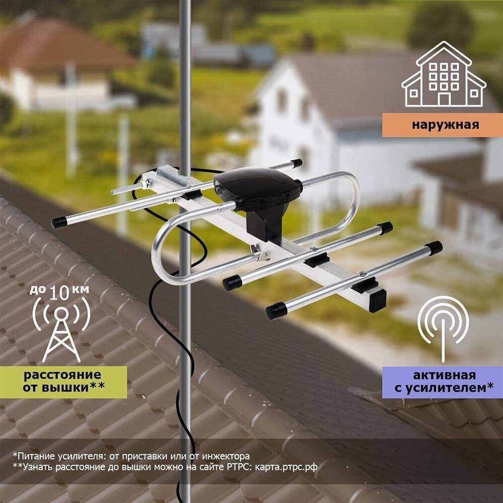 Антенна активная, (со встроенным усилителем) индивидуальная, уличной установки, предназначена для приема цифрового эфирного ТВ вещания в стандарте DVB-T2. Использутся для приема цифрового эфирного вещания на современных телевизорах или комбинированных ресиверах, укомплектованных тюнером стандарта DVB-T2. Коэффициент усиления: 27 дБи. Волновое сопротивление: 75 Ом. Питание усилителя: 5 В, от приставки или инжектора. Тип подключения: F- коннектор. Размеры в сборе: 366 х 304 х 80 мм. Масса: 0,5 кг. Тип упаковки: пакет.
