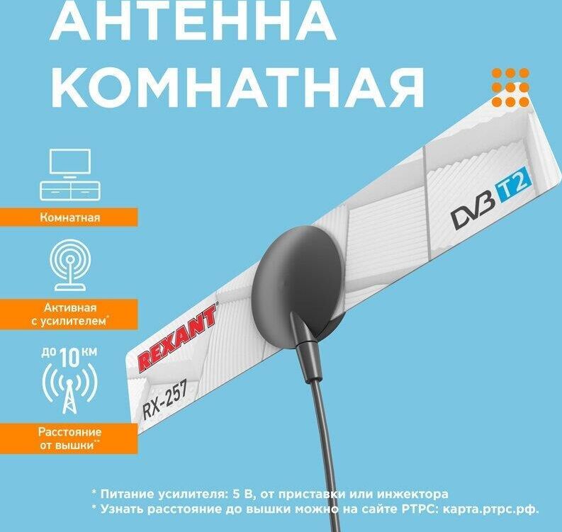 Антенна активная (со встроенным усилителем), комнатной установки, предназначена для приема цифрового эфирного ТВ вещания в стандарте DVB-T2. Использутся для приема цифрового эфирного вещания на современных телевизорах или комбинированных ресиверах, укомплектованных тюнером стандарта DVB-T2. Коэффициент усиления: 33 дБи. Волновое сопротивление: 75 Ом. Кабель: 1,2 м. Тип подключения: ТВ штекер. Питание усилителя: 5 В, от приставки или инжектора. Масса: 0,1 кг. Размеры в сборе: 210х40х20 мм. Тип упаковки: коробка с держателем, картон.