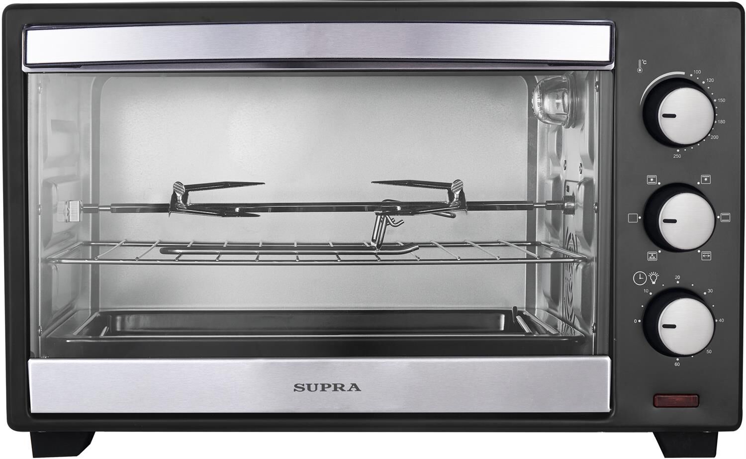 Электрическая печь с грилем и конвекцией, объем: 45 л, потребляемая мощность: 2000 Вт, механическое управление, конвекция, гриль, электрический гриль, температура: 100-250°С, таймер отключения: до 60 минут, сигнал окончания приготовления, внутренняя подсветка, 6 режимов нагрева, индикация включения, комплектация: металлическая решетка, плоский противень, круглая форма для пиццы, ухват для противня, вертел, ухват для вертела