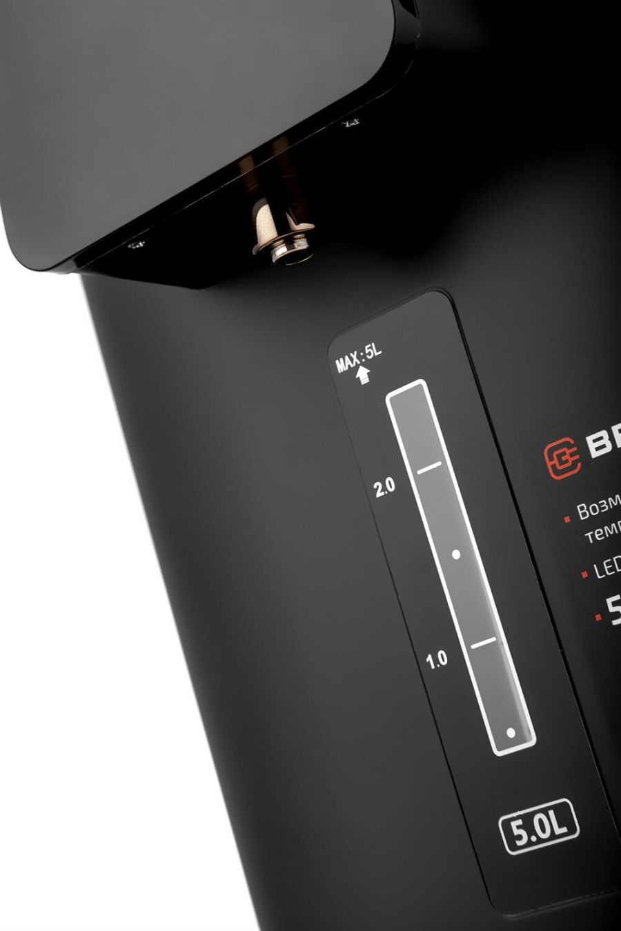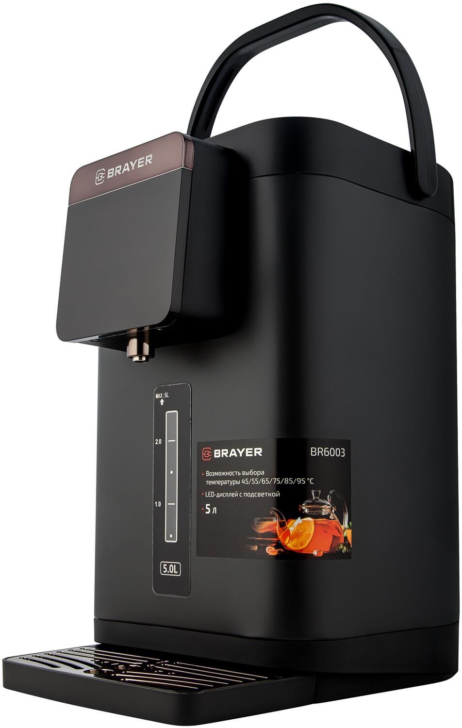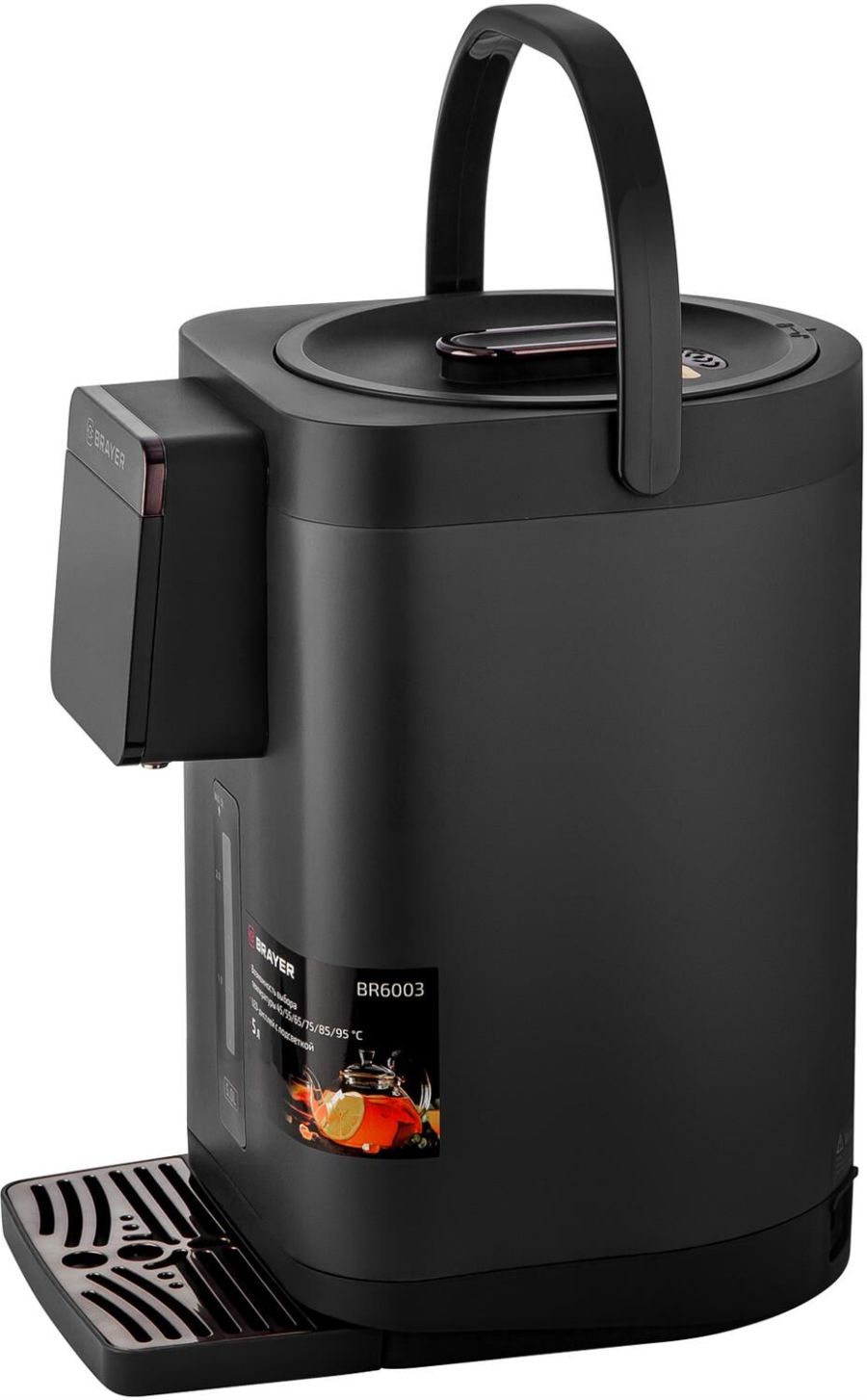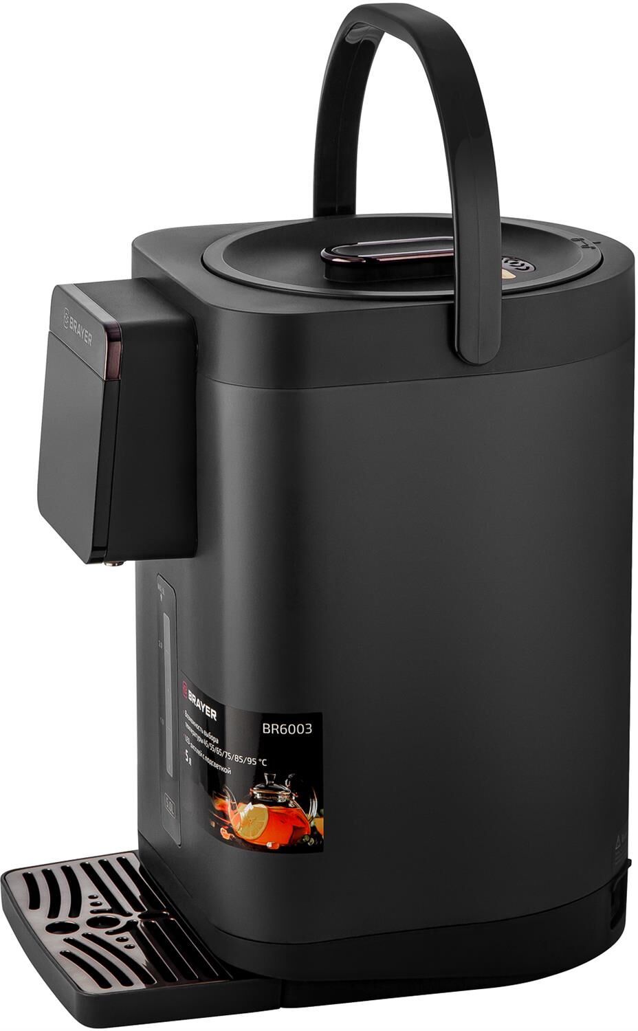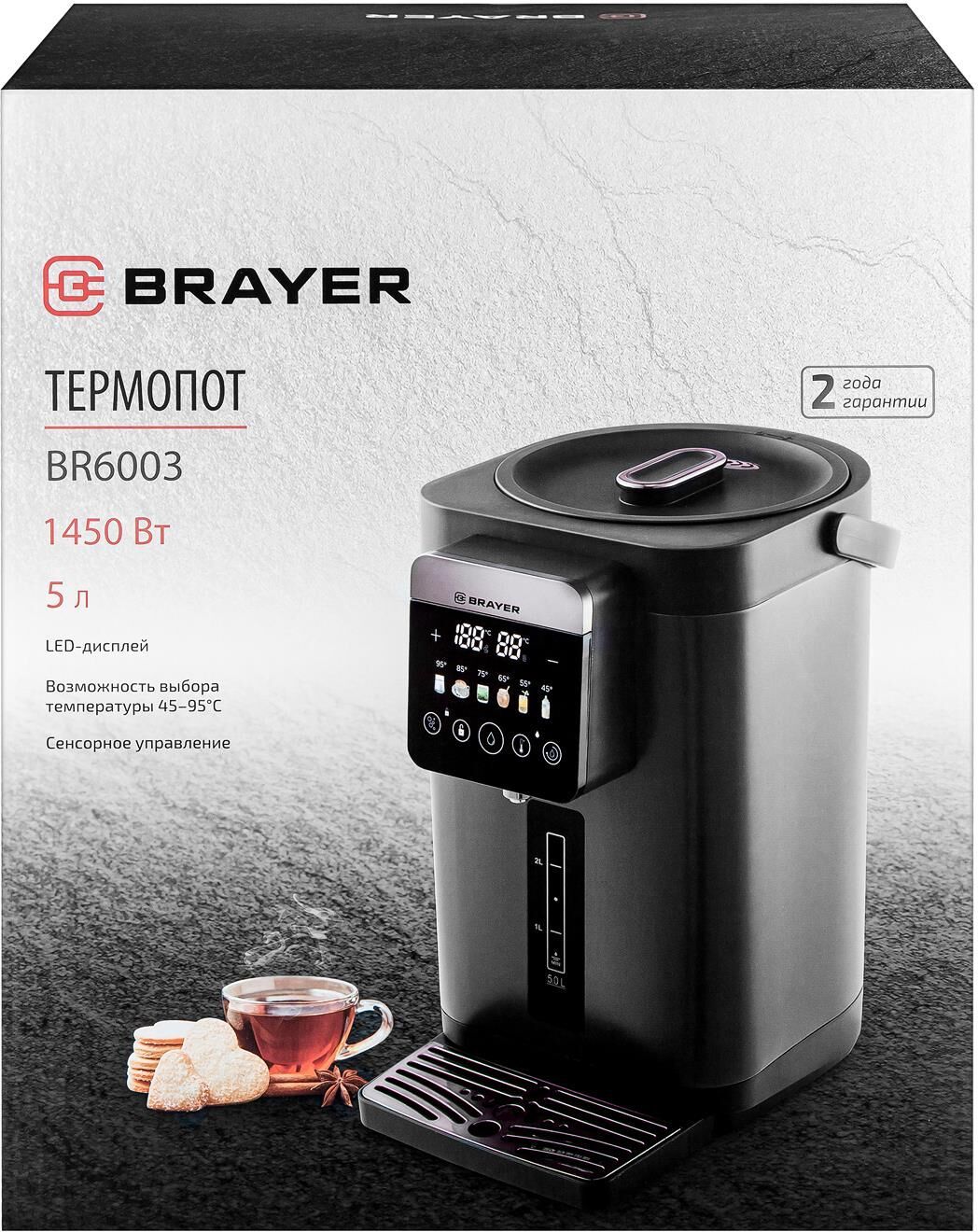 Максимальная мощность 1450 Вт Максимальный объем 5 л Подача воды с помощью автоматической помпы Поддержание температуры воды для разных напитков (45°/55°/65°/75°/85°/95°С) Функция повторного кипячения Функция поддержания температуры воды Сенсорное управление LED-дисплей Блокировка подачи воды Корпус из высококачественного металла Съёмный поддон для капель Автоотключение при отсутствии воды Электропитание 220-240 В, ~ 50-60 Гц