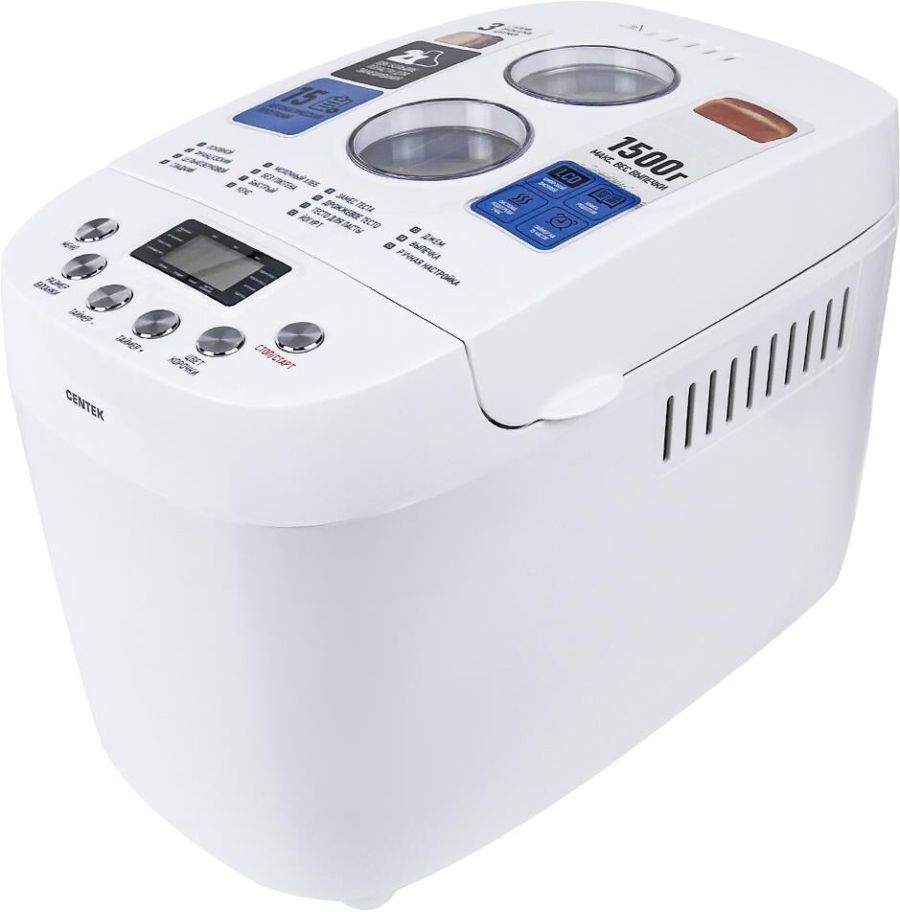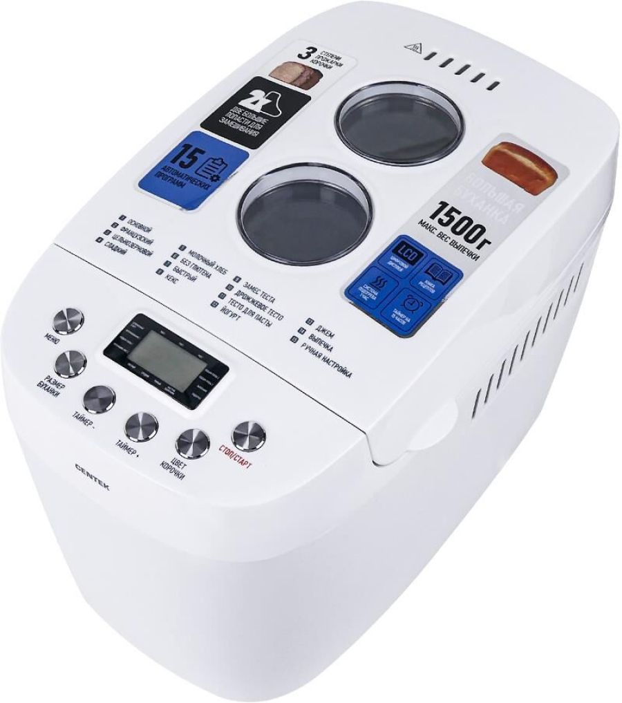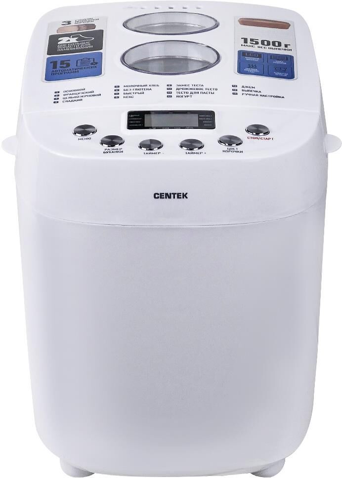 Хлебопечка Centek CT-1417 (белый) 1500г, 850Вт, 15 программ, таймер 15ч, LCD, 2 окошка, 2 лопатки