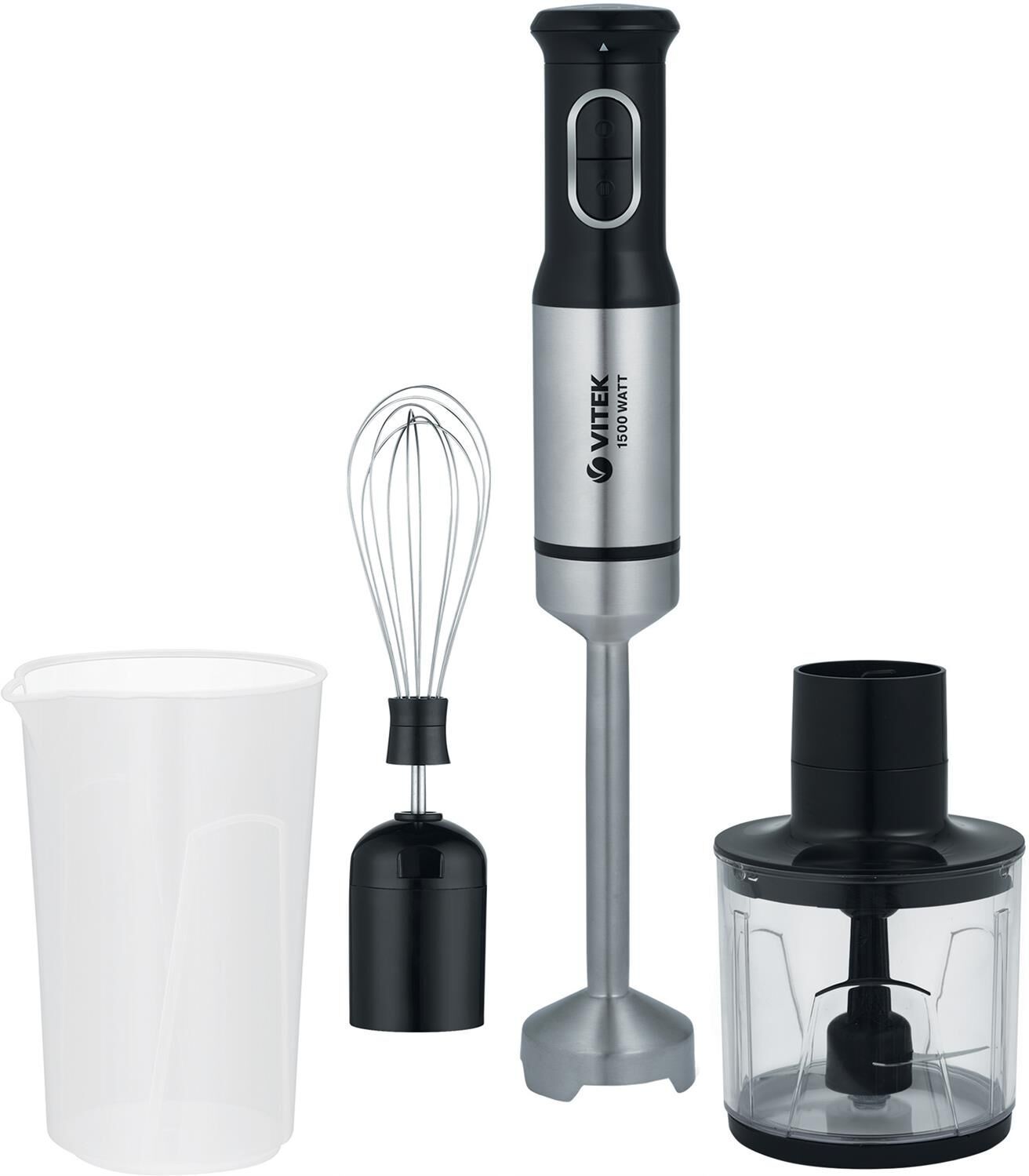 Блендер погружной. Мощность: 1500 вт, Количество скоростей: 6, Турборежим, Плавная регулировка скорости, Управление: механическое, Материал корпуса: нержавеющая сталь/пластик, Материал погружной части: нержавеющая сталь, Емкость измельчителя: 350 мл, Емкость мерного стакана: 600 мл, Венчик для взбивания, Мерный стакан, Длина сетевого шнура: 110см, Измельчитель, Цвет: Черный/серебро