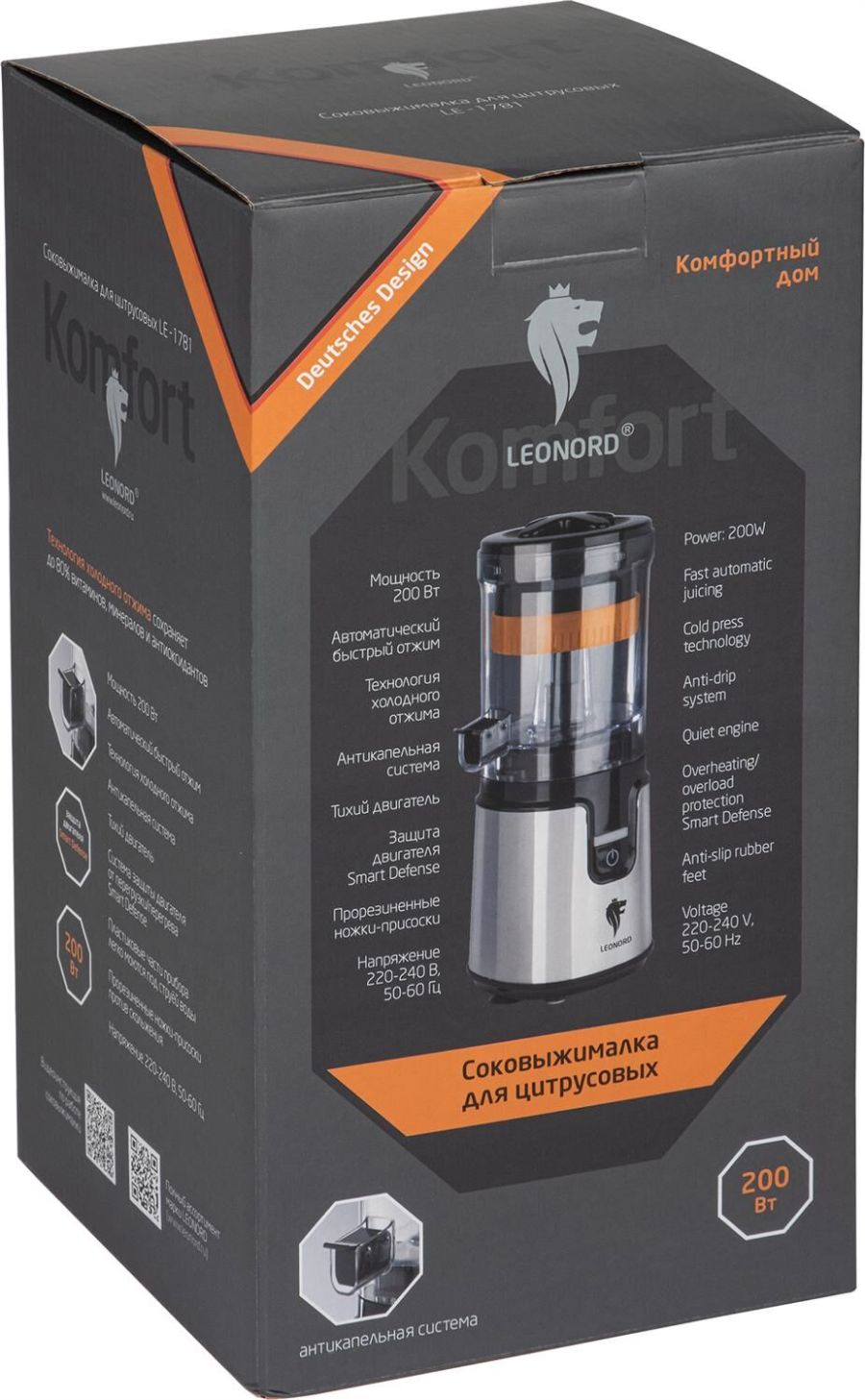 Мощность 200 Вт Автоматический быстрый отжим Технология холодного отжима Антикапельная система Тихий двигатель Защита двигателя Smart Defence Прорезиненные ножки-присоски Напряжение 220-240 В Гарантия 2 года
