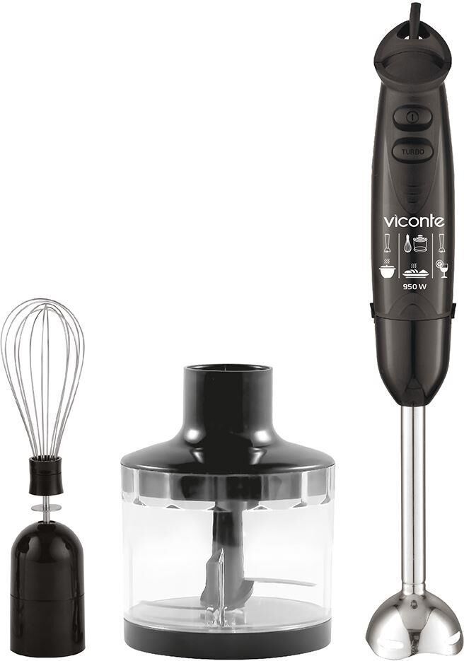 Погружной блендер Viconte VC-4447 950 W, Погружной блендер, мощность 950 W, современный эргономичный дизайн, пульсовый режим работы, 2 скорости, лезвия из нержавеющей стали, металлическая нога блендера, венчик для взбивания, чаша с ножом для рубки и измельчения, 500 мл; автоматическая блокировка при неправильно установленной насадке, удобство и простота в обращении и чистке.