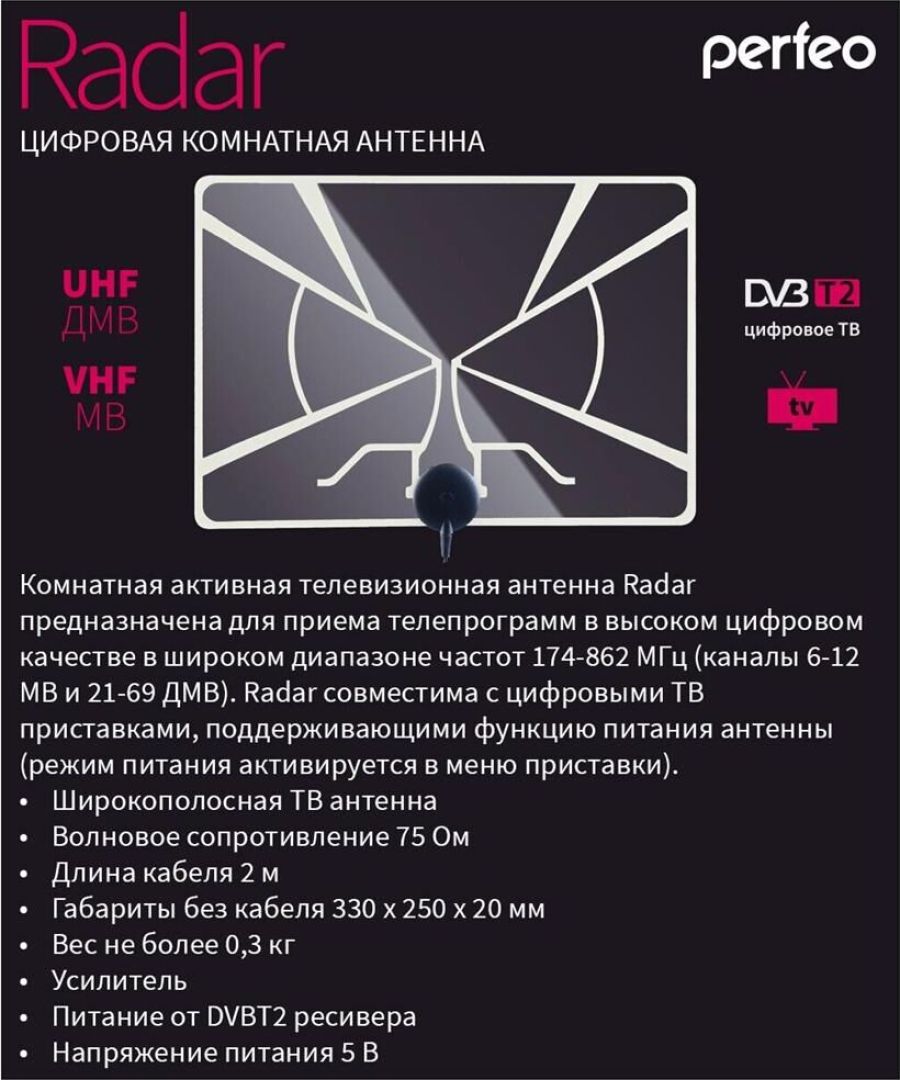 Комнатная активная телевизионная антенна «RADAR» предназначена для приема телепрограмм в высоком цифровом качестве в широком диапазоне частот 174-862 МГц (каналы 6-12 МВ и 21-69 ДМВ). «RADAR» совместима с цифровыми ТВ приставками, поддерживающими функцию питания антенны (режим питания активируется в меню приставки). Возможно использование антенны совместно с USB-инжектором питания. При этом необходимость в ТВ приставке отпадает, а USB-инжектор подключается к штатному USB-гнезду в телевизоре, обеспечивая антенну необходимым питанием. Посмотреть зону покрытия цифрового ТВ (DVB-T2) вашего района или населенного пункта можно на официальном сайте РТРС: http: //rtrs.ru
