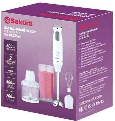 800 Вт, мощный и тихий DC мотор, 2 скорости работы, лезвия из нерж.стали, погруж.часть блендера из нерж.стали, насадка-венчик из стали, градуированный стакан (0,7 л), чоппер (0,5 л) с острыми ножами из нерж.стали