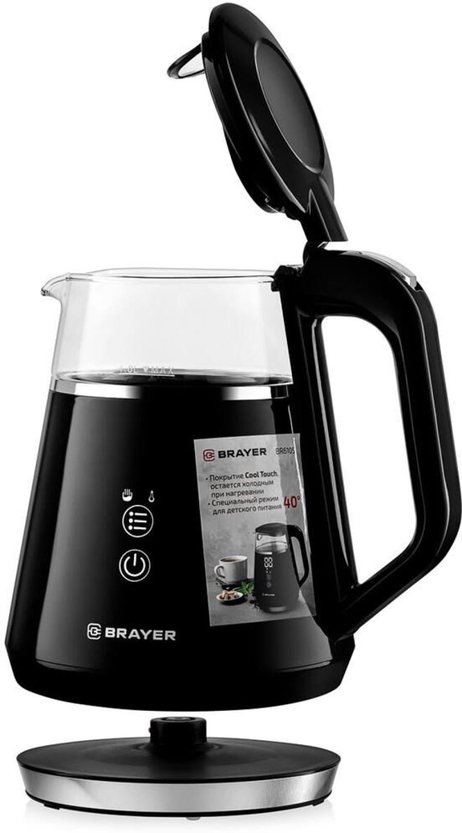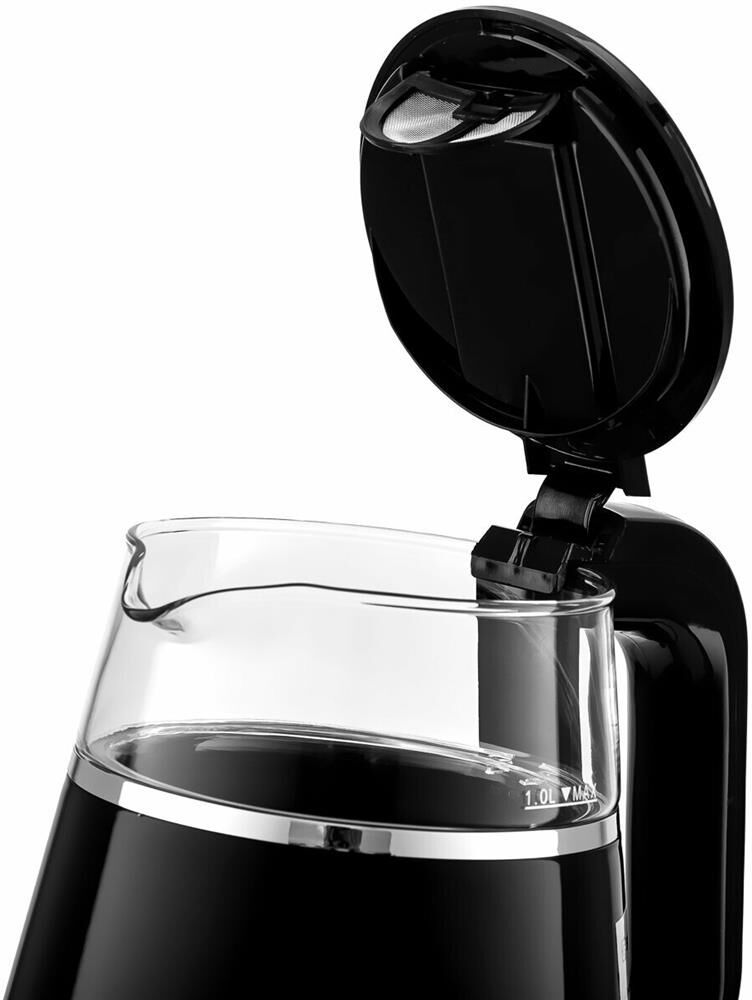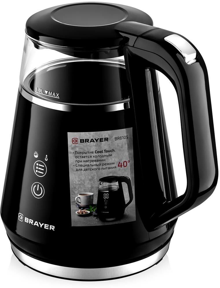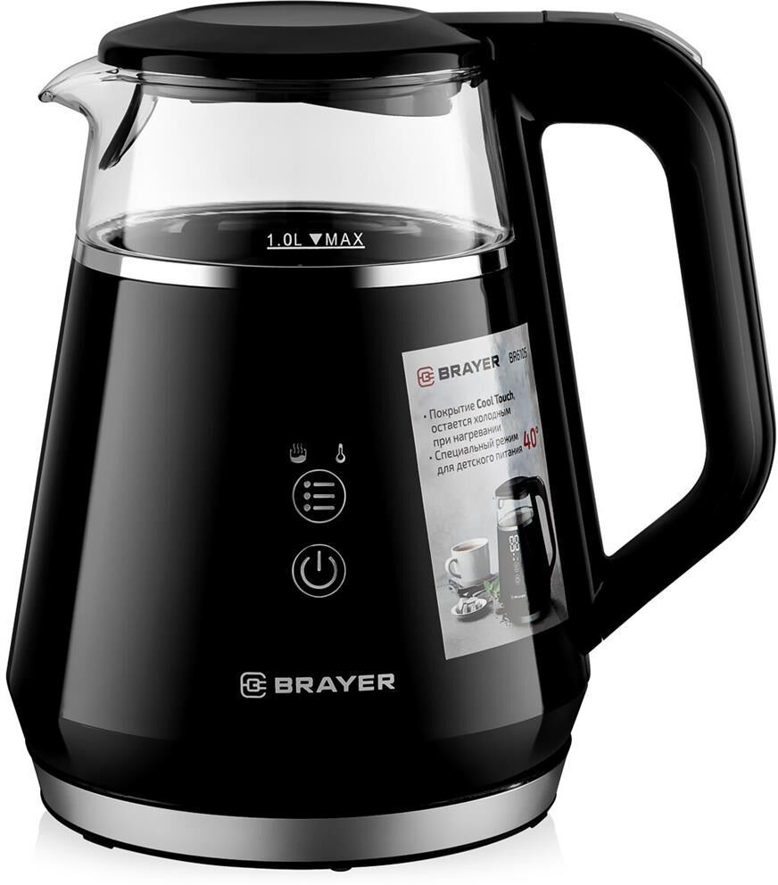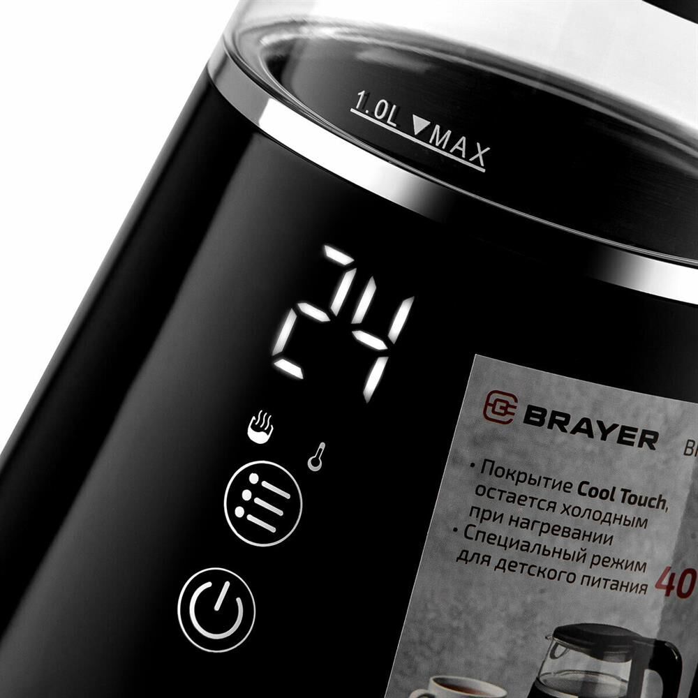 Максимальная мощность 1100 Вт Объём 1 л Сенсорное управление Корпус из высокопрочного термостойкого стекла с пластиковым покрытием Cool Touch, которое остается холодным при нагревании Функции кипячения и подогрева воды для разных сортов чая (40-100° С) Поддержание заданной температуры в течение 2-х часов Автоотключение при закипании воды Отключение при отсутствии воды Электропитание 220-240 В, ~ 50-60 Гц