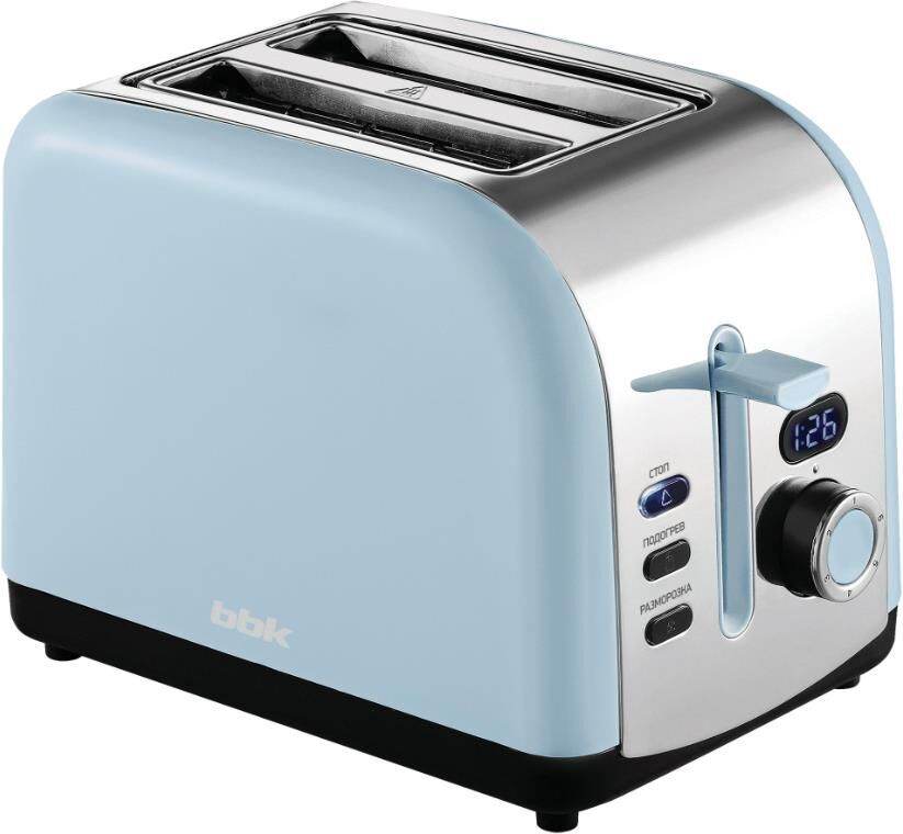 Индикатор питания; Да; Тип управления; Механический; Максимальная мощность (Вт); 800; Защита от перегрева; Да; Режимы приготовления; 6; Регулировка степени поджаривания; 6; Функция разогрева; Да; Функция разморозки; Да; Автоматическое центрирование; Да; Количество тостов; 2; Цвет корпуса; светло голубой; Термоизолированный корпус; Да; Материал корпуса; Пластик\металл