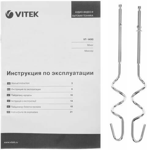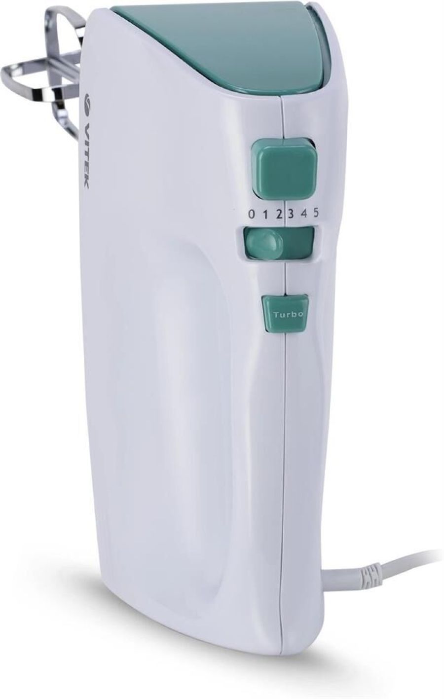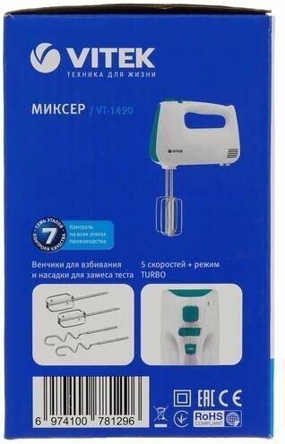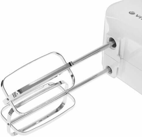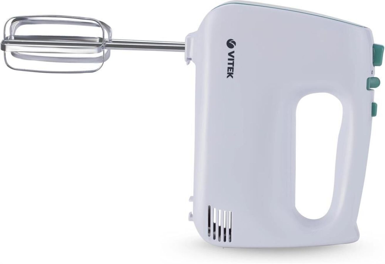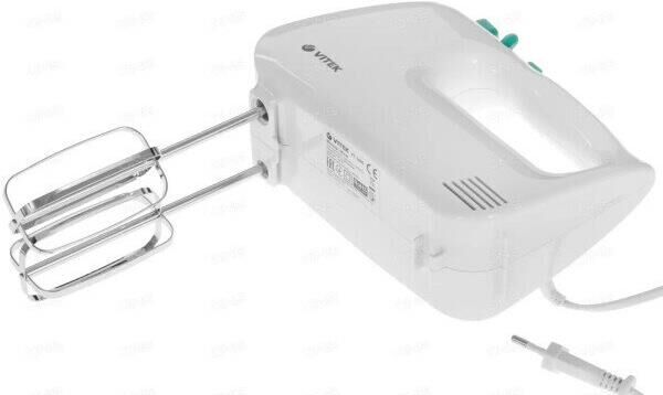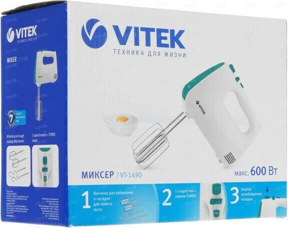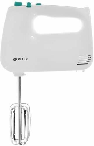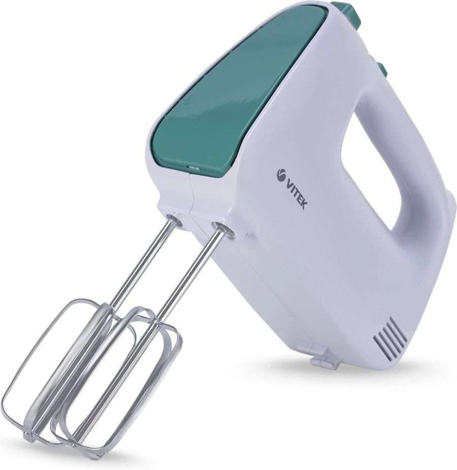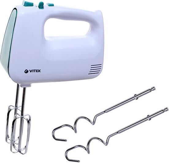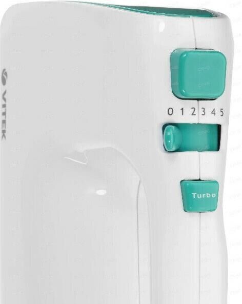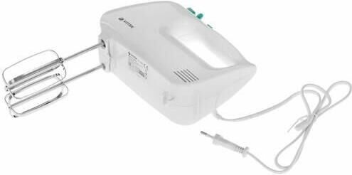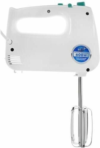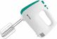 Миксер ручной. Мощность: 600 вт, Число скоростей: 5, Турборежим, Венчик для взбивания: 2, Крюки для замешивания теста, Количество насадок: 4, Кнопка отсоединения насадок, Материал корпуса: пластик, Длина сетевого шнура: 120 см, Цвет: Белый/зеленый.