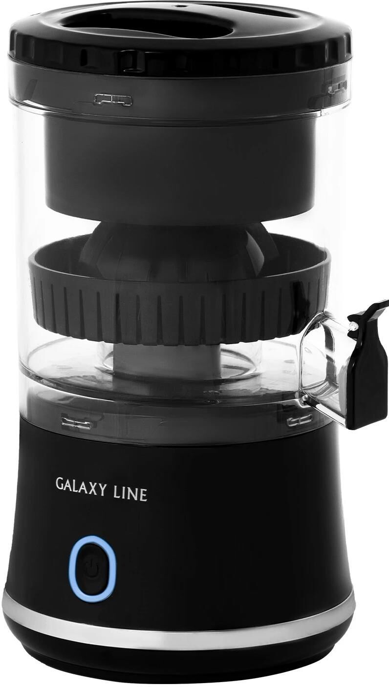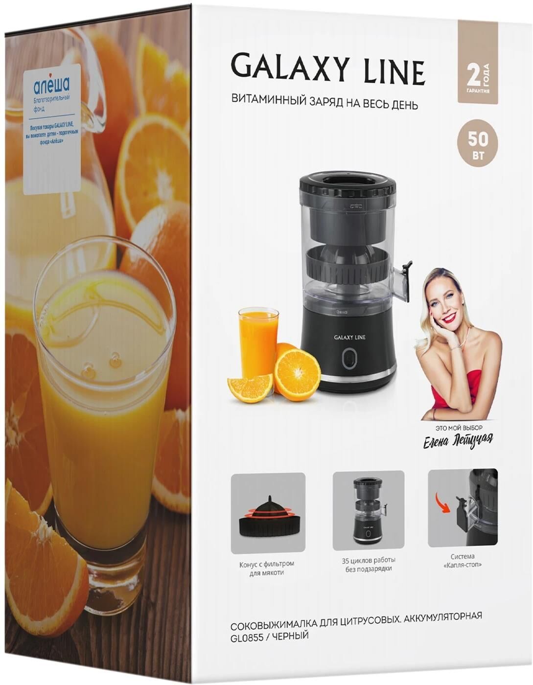Соковыжималка аккумуляторная Galaxy LINE GL 0855, черный, для цитрусовых, 50 Вт, 250 мл, система "капля-стоп", конус с фильтром для мякоти, индикатор заряда, конус с фильтром для мякоти, аккумулятор Li-ion емкостью 1500 ма*ч, напряжение батареи 3,7 В, 35 циклов работы без подзарядки, зарядка в течение 2 часов