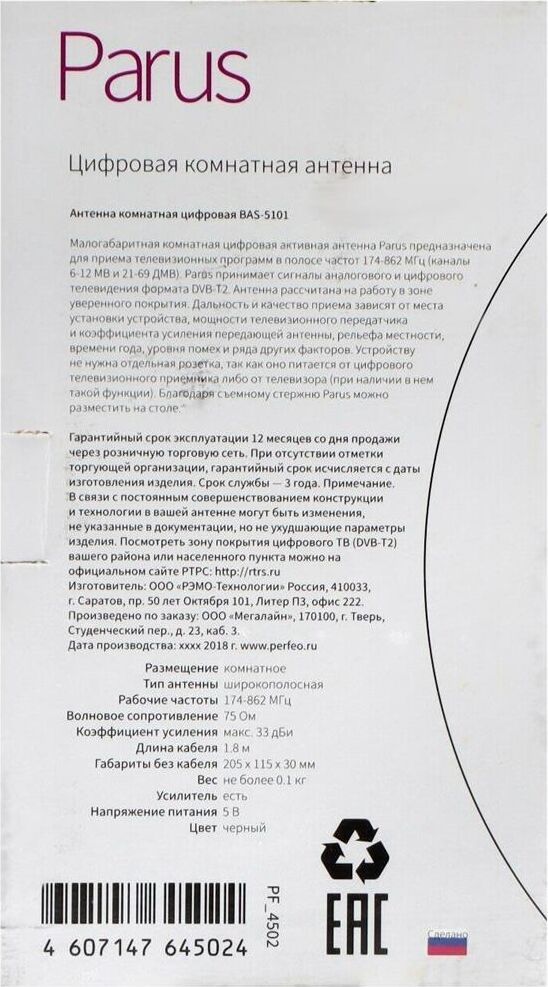 Антенна комнатная, активная, для приема аналогового и цифрового ТВ, рабочие частоты, МГц174..862, волновое сопротивление, Ом75, коэффициент усиления, дБ33, длина кабеля - 1,2 м.