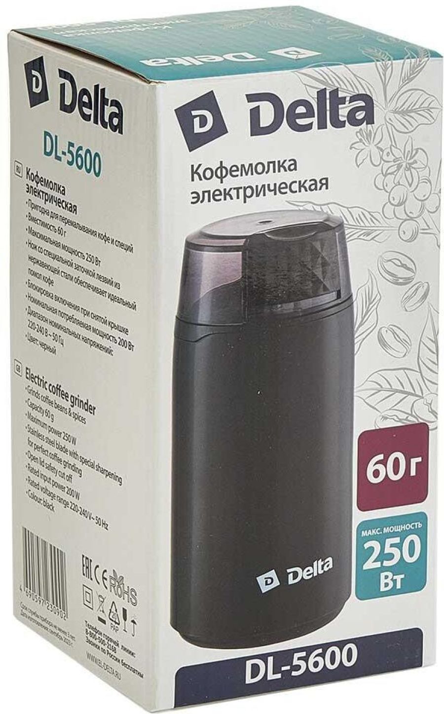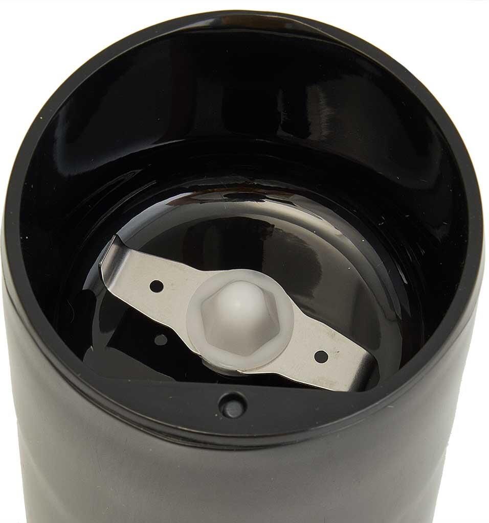 Параметры Максимальная мощность 250 Вт Номинальная потребляемая мощность 200 Вт Вместимость резервуара 60 г Описание Кофемолка электрическая предназначена для размола зерен кофе в бытовых и аналогичных условиях Пригодна для перемалывания кофе и специй Цвет: черный Нож со специальной заточкой лезвий из нержавеющей стали обеспечивает идеальный помол кофе Блокировка включения при снятой крышке Упаковка: цветная коробка