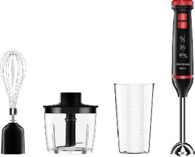 Параметры Максимальная мощность 1500 Вт Номинальная потребляемая мощность 600 Вт Объем чаши измельчителя 500 мл Объем мерного стакана 700 мл Описание Блендер электрический предназначен для смешивания, измельчения и взбивания продуктов и жидкостей в бытовых и аналогичных условиях Ножи из нержавеющей стали Три сменные насадки: насадка для смешивания венчик для взбивания измельчитель Мерный стакан Противоскользящие ножки чаши измельчителя Плавная регулировка скорости Режим «ТУРБО» Цвет: белый Упаковка: цветная коробка