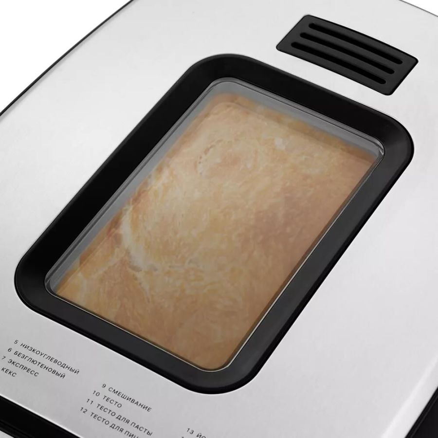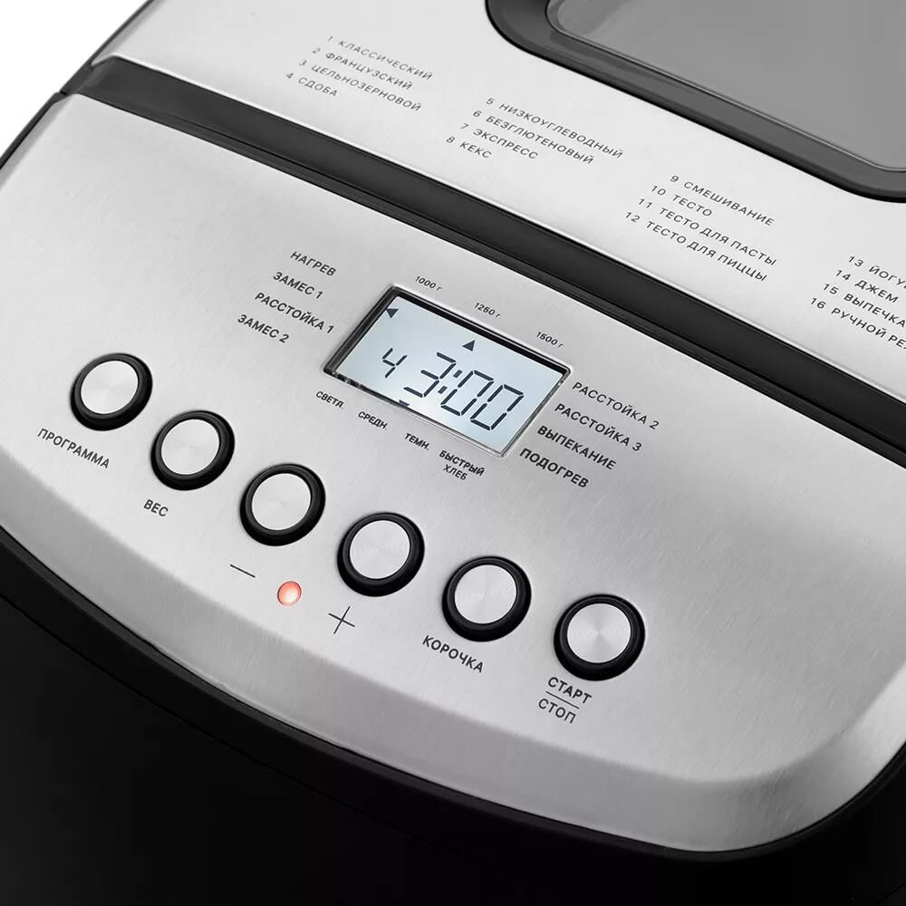 Мощность 850 Вт Тип управления электронное Автоматические программы 16 Материал корпуса пластик + нержавеющая сталь Ёмкость формы для выпечки 3,8 л Покрытие формы для выпечки антипригарное Вес выпечки 1000/1250/1500 г Отложенный старт до 15 ч Длина сетевого шнура 0,8 м Размер устройства 428 х 267 х 296 мм Вес устройства 6,4 кг