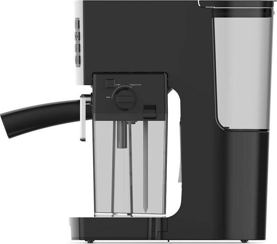 Давление 19 бар / Резервуар для воды 1.4 л / Резервуар для молока 0.39 л / Мощность 1450 Вт / Электронное управление / Корпус из нержавеющей стали / Автоматический капучинатор / Регулировка крепости кофе / Выбор объема порции кофе и молока / Индикатор необходимости очистки / Многоразовый фильтр и мерная ложка в комплекте / Съемный поддон для сбора жидкости / Откидная площадка для кружек малого объёма