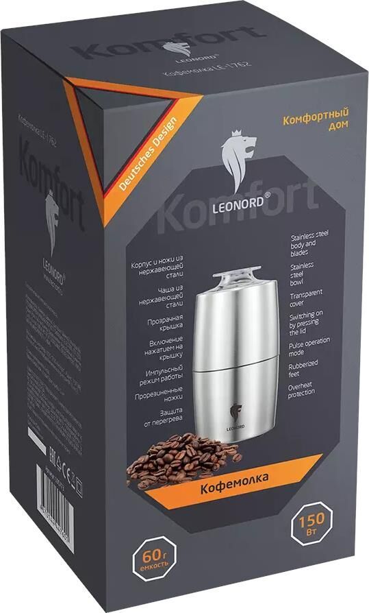 Мощность 150 Вт Корпус и ножи из нержавеющей стали Емкость 60 г кофе в зернах Чаша из нержавеющей стали Прозрачная крышка Включение нажатием на крышку Импульсный режим работы Прорезиненные ножки Защита от перегрева Длина шнура 104 см Гарантия 2 года