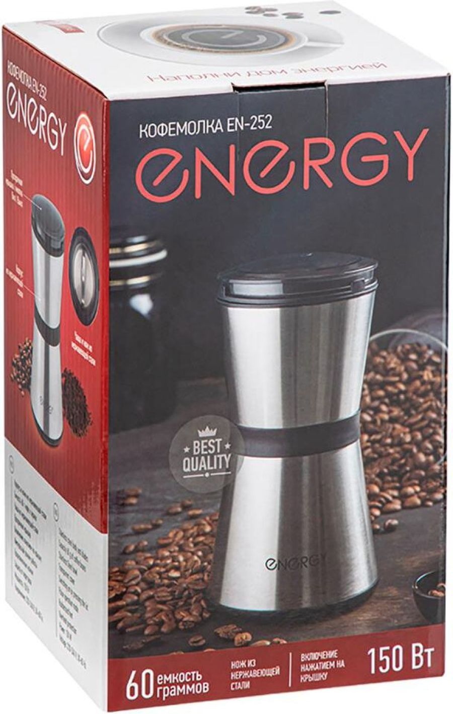 Емкость 60 г кофе в зернах Корпус и ножи из нержавеющей стали Ножи из нержавеющей стали Чаша из нержавеющей стали Включение нажатием на крышку Прозрачная крышка Прорезиненные ножки Мощность 150 Вт Напряжение: 220-240 В, 50-60 Гц Длина шнура 102,5 см