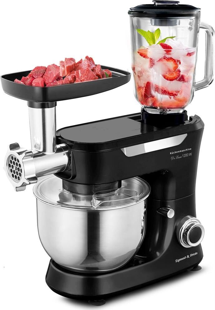Кухонная машина Мощность: 1200 Вт Напряжение: 220-240В, 50/60Гц Объем чаши: 5л Объем блендера: 1,5л Кол-ва насадок: 12 Кол-во скоростей: 6 Импульсный режим (турбо): да Тип двигателя: AC (с медной обмоткой) Материал корпуса: ABS - пластик Материал чаши: нерж сталь SUS 304 Материал блендера: стекло