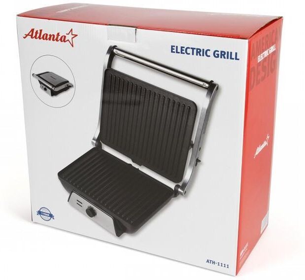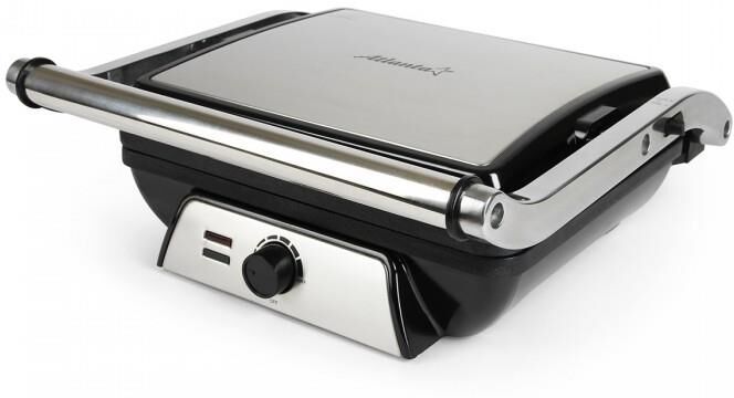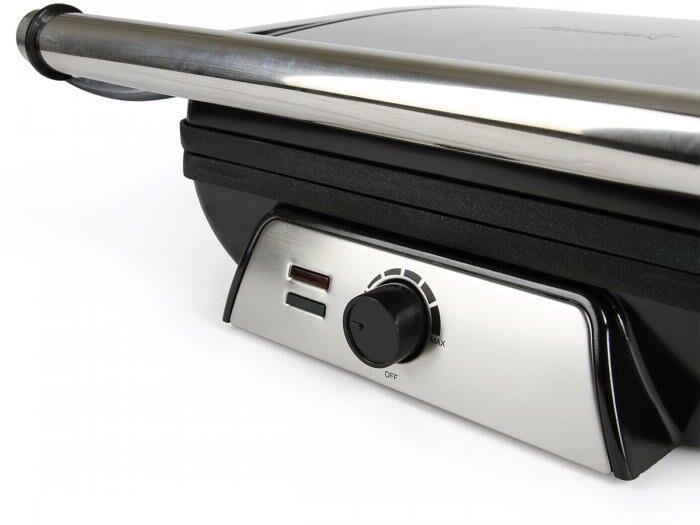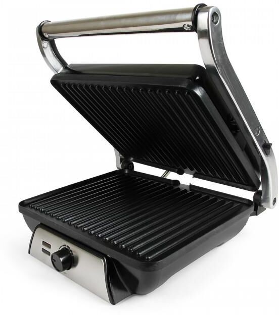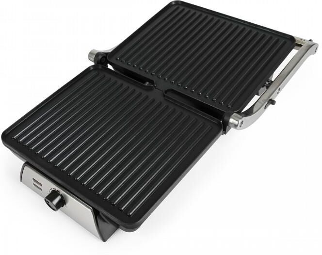 Гриль электрический, мощность 2000 Вт, регулируемый термостат (максимальная температура 240°С), 2 рифленые панели для жарки, размер панели 29,7х23,6 см, антипригарное покрытие, открытие панелей на 180° (возможность приготовления на 2 пластинах одновременно), индикатор работы, прорезиненные ножки. Корпус из нержавеющей стали и термостойкого пластика. Комплектация: резервуар для сбора масла.