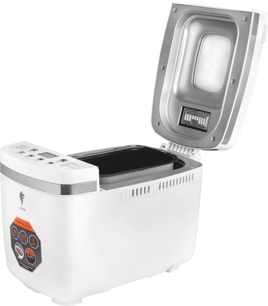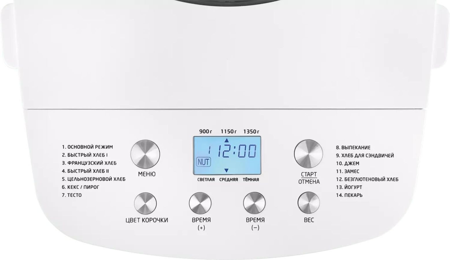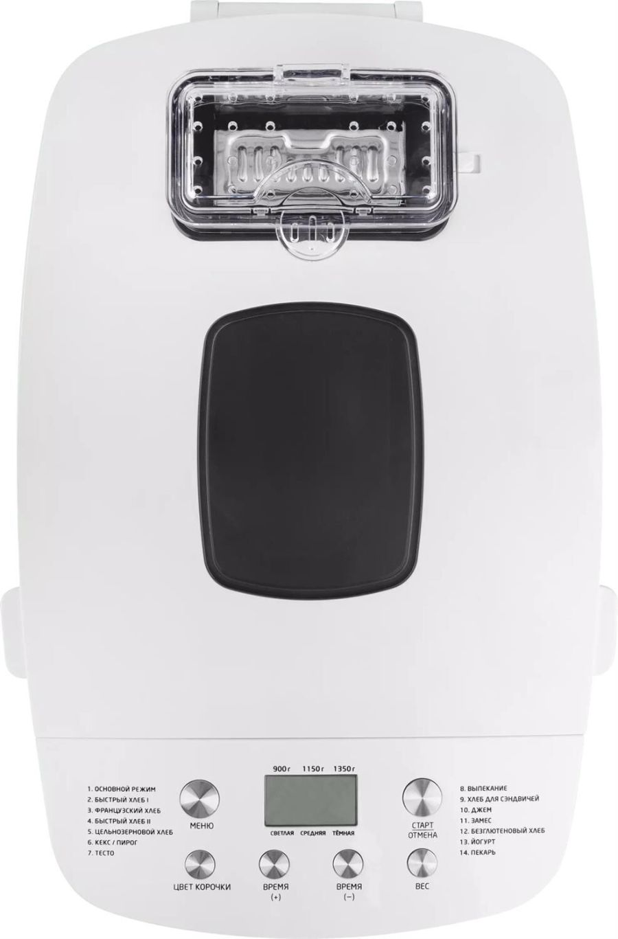 Мощность 850 Вт Размер буханки 900/1150/ 1350 г 14 программ приготовления: 1. БЕЛЫЙ ХЛЕБ 2. БЫСТРЫЙ 3. ФРАНЦУЗСКИЙ ХЛЕБ 4. СВЕРХБЫСТРЫЙ 5. ЦЕЛЬНОЗЕРНОВОЙ 6. ПИРОГ 7. ТЕСТО 8. ВЫПЕЧКА 9. СЛАДКИЙ ХЛЕБ 10. ДЖЕМ 11. СМЕШИВАНИЕ/ПЕРЕМЕШИВАНИЕ 12. БЕЗ ГЛЮТЕНА 13. ЙОГУРТ 14. ПОЛЬЗОВАТЕЛЬСКИЙ 3 варианта корочки: светлая, средняя, темная 13-часовой таймер отсрочки старта Функция памяти 10 минут Автоматическое поддержание температуры в течение 1 часа 2 тестомешателя Контейнер для добавления ингредиентов 220-240 В, 50-60 Гц