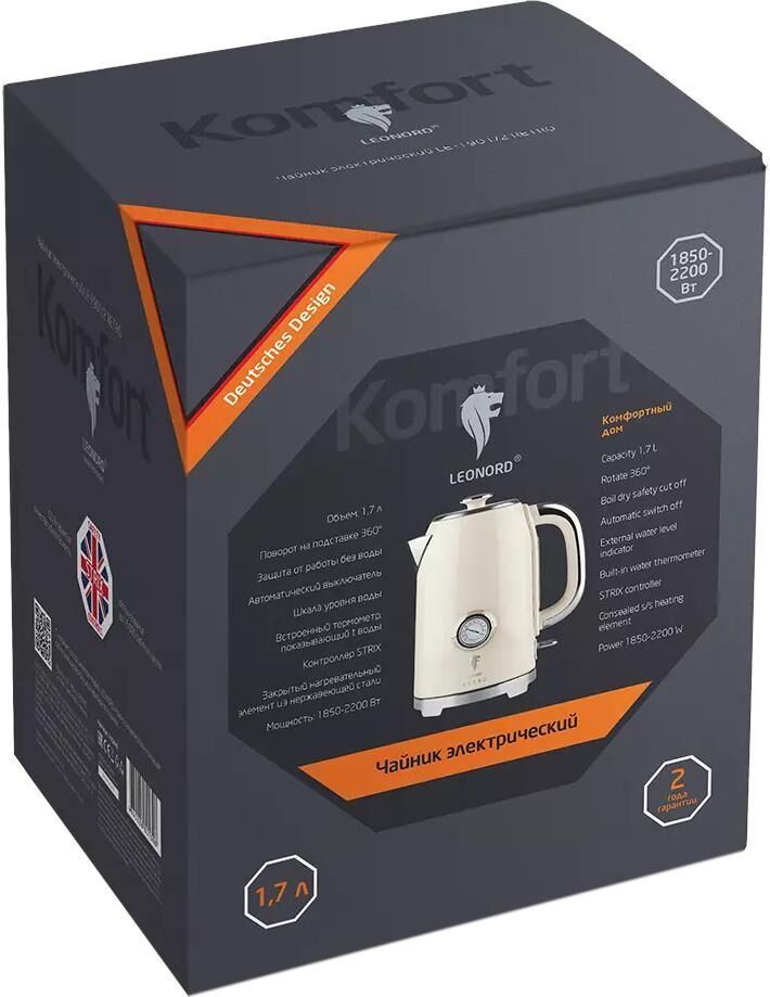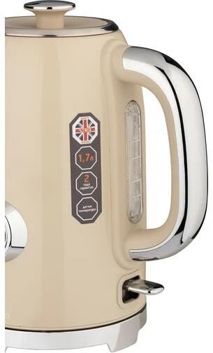 Серия RETRO Объем: 1.7 л Поворот на подставке 360° Защита от работы без воды Автоматический выключатель Шкала уровня воды Встроенный термометр, показывающий t воды Контроллер STRIX Закрытый нагревательный элемент из нержвающей стали Мощность: 1850-2200 Вт Гарантия 2 года Цвет: бежевый
