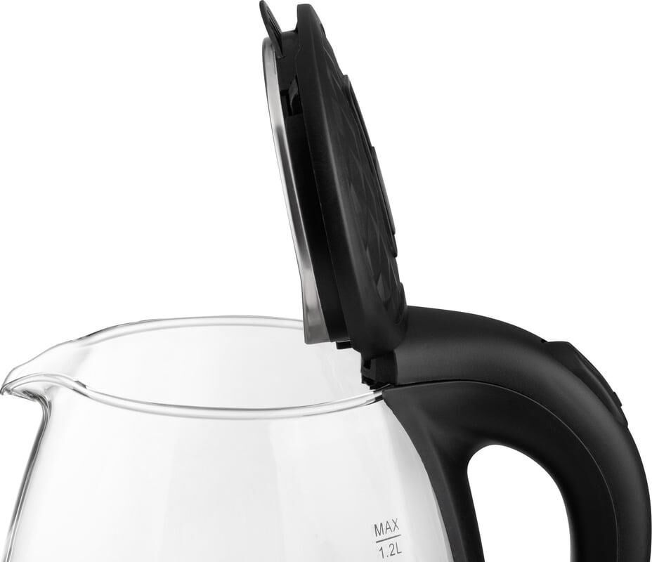 Объем 1,2 л Корпус из термостойкого стекла Шкала уровня воды Внутренняя подсветка Закрытый нагревательный элемент из нержавеющей стали Поворот на подставке 360° Защита от работы без воды Автоматический выключатель Место для хранения шнура Мощность 1500 Вт Цвет чёрный