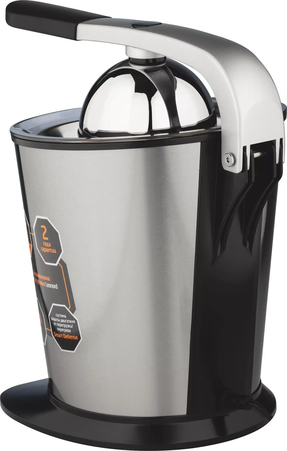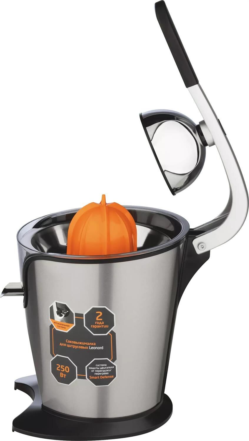 Автоматический запуск двухнаправленного поворота Тихий двигатель Антикапельная система Прорезиненные ножки Съемные детали для удобства очистки 2 конуса-насадки для цитрусовых разной величины Корпус из нержавеющнй стали Металлический сетчатый фильтр Система защиты двигателя от перегрузки/перегрева Smart Defense Мощность 250 Вт Напряжение 220-240В, 50-60Гц 2 года гарантии Длина шнура 1,2 м