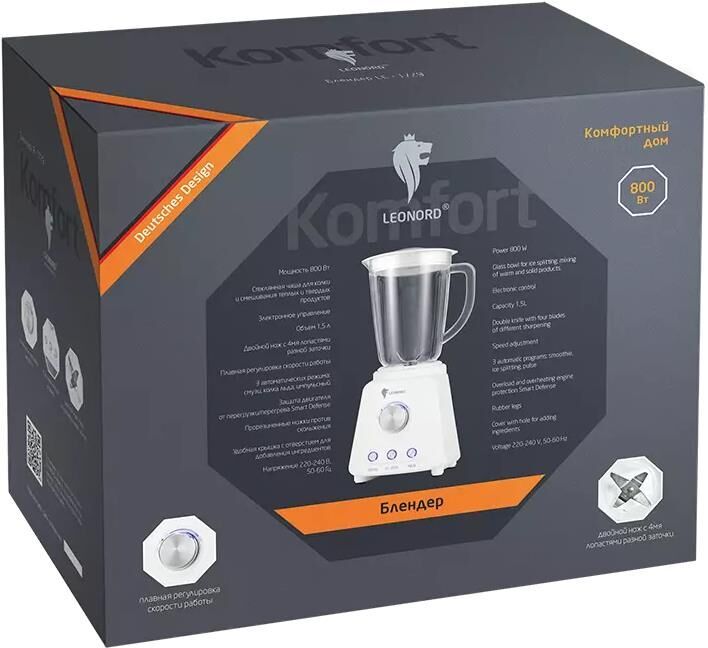 Мощность 800 Вт Стеклянная чаша для колки и смешивания теплых и твердых продуктов Объем 1,5 л Электронное управление Двойной нож с 4-мя лопастями разной заточки Плавная регулировка скорости работы Три автоматических режима: смузи, колка льда, импульсный Защита двигателя от перегрузки/перегрева Smart Defense Прорезиненные ножки против скольжения Удобная крышка с отверстием для добавления ингредиентов Напряжение 220-240 В, 50-60 Гц 2 года гарантии Длина шнура 1,2 м
