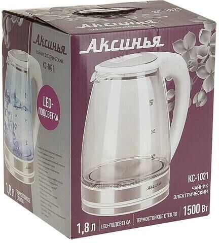Параметры Объем 1,8 л Номинальная потребляемая мощность 1500 Вт Описание Чайник электрический предназначен для нагрева воды в бытовых и аналогичных условиях Корпус из высококачественного термостойкого стекла Вращение корпуса на 360° Закрытый нагревательный элемент Шкала уровня воды Внутренняя LED-подсветка Отсек для хранения шнура питания Автоматическое отключение при закипании Блокировка включения без воды Цвет: белый Упаковка: цветная коробка