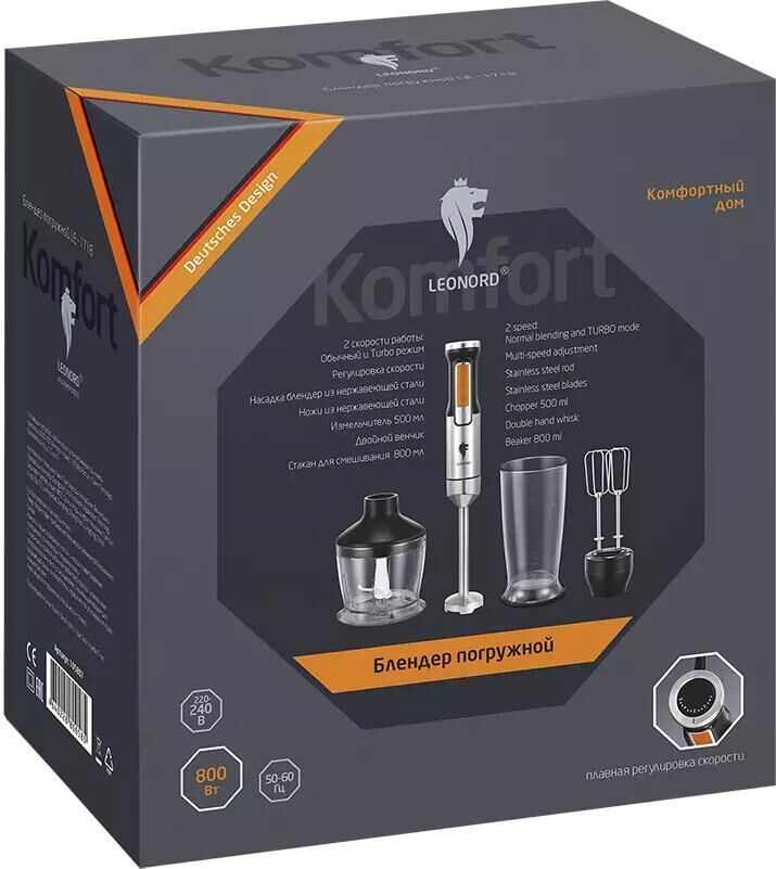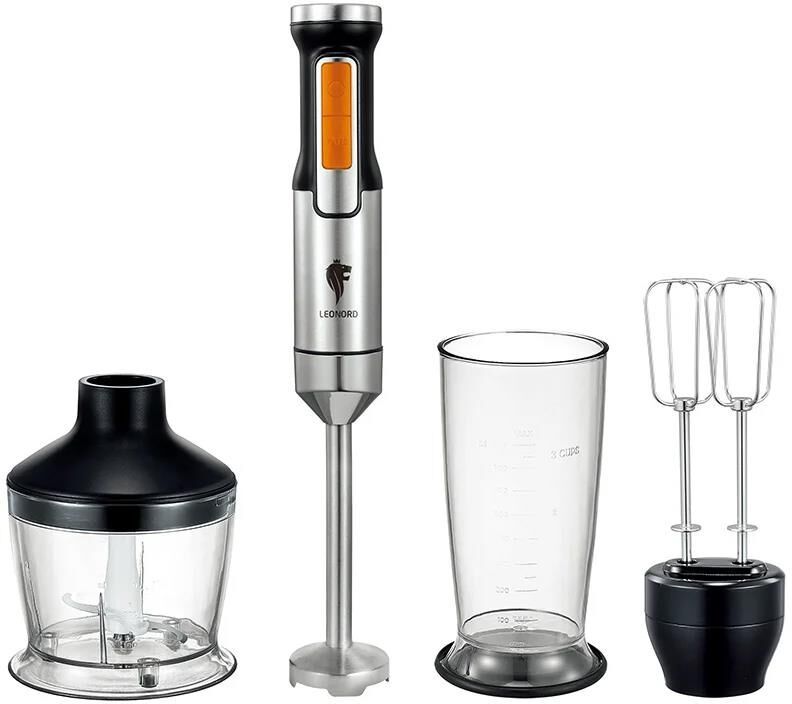 2 скорости работы: Обычный и Turbo режим Регулировка скорости Насадка блендер из нержавеющей стали Ножи из нержавеющей стали Измельчитель 500 мл Двойной венчик Стакан для смешивания 800 мл Мощность 800 Вт Напряжение: 220-240 В, 50-60 Гц Гарантия 2 года