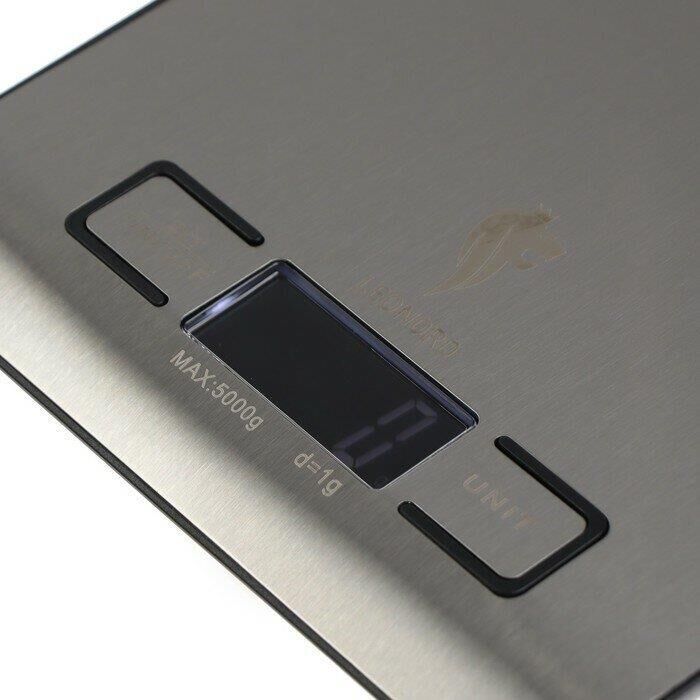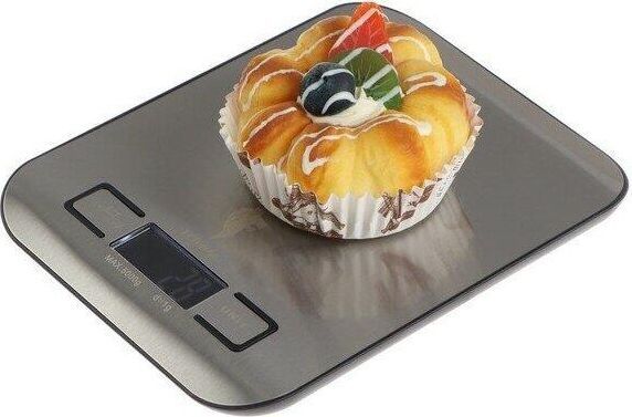 Металлическая поверхность 18*13,7см LCD дисплей с подсветкой Максимальная нагрузка 5 кг Выбор единицы измерения: грамм, фунт, унция, миллилитр Цена деления 1 грамм Функция "Тара" Проризиненные ножки Автоотключение Индикатор перегрузки и заряда батареи Питание от 2*ААА (не входят в комплект) Гарантия 2 года