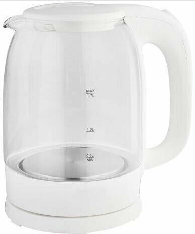 1,7 л. Термостойкое стекло. Мощность 2200 Вт. Закрытый нагревательный элемент, Защита от включения без воды, Защита от перегрева, Фильтр от накипи Габариты изделия/упаковки 221.8* 156.3 * 230/21*18*23.8. Вес нетто/брутто 1,27/1,38