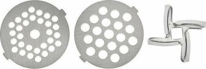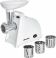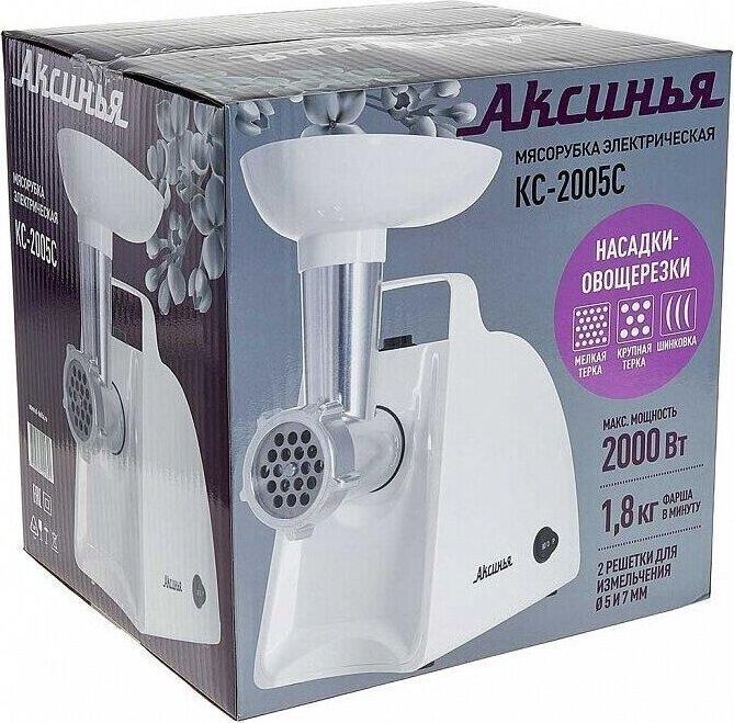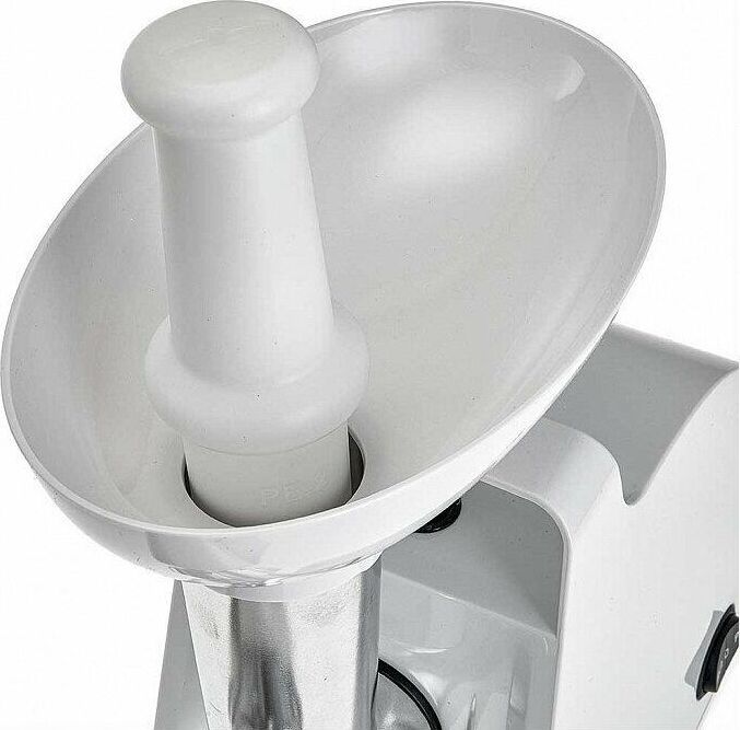 Максимальная мощность 2000 Вт Номинальная потребляемая мощность 300 Вт Производительность 1,8 кг/мин Описание Мясорубка электрическая предназначена для измельчения вареного или сырого мяса и подобных продуктов, а также приготовления печенья в бытовых и аналогичных условиях Подходит для обработки любого вида мяса Цвет: белый Прочный металлический шнек Металлический привод шнека увеличивает надежность и долговечность прибора Крестообразный нож из высококачественной нержавеющей стали Две решетки для измельчения с отверстиями разного диаметра - 5 и 7 мм 3 насадки-овощерезки: мелкая терка крупная терка шинковка Две насадки «КУББЕ» Насадка для набивки колбасок Удобный толкатель Противоскользящие прорезиненные ножки Функция РЕВЕРС обеспечивает простоту очистки шнека при забивании продуктами Система защиты двигателя от перегрева Упаковка: цветная коробка