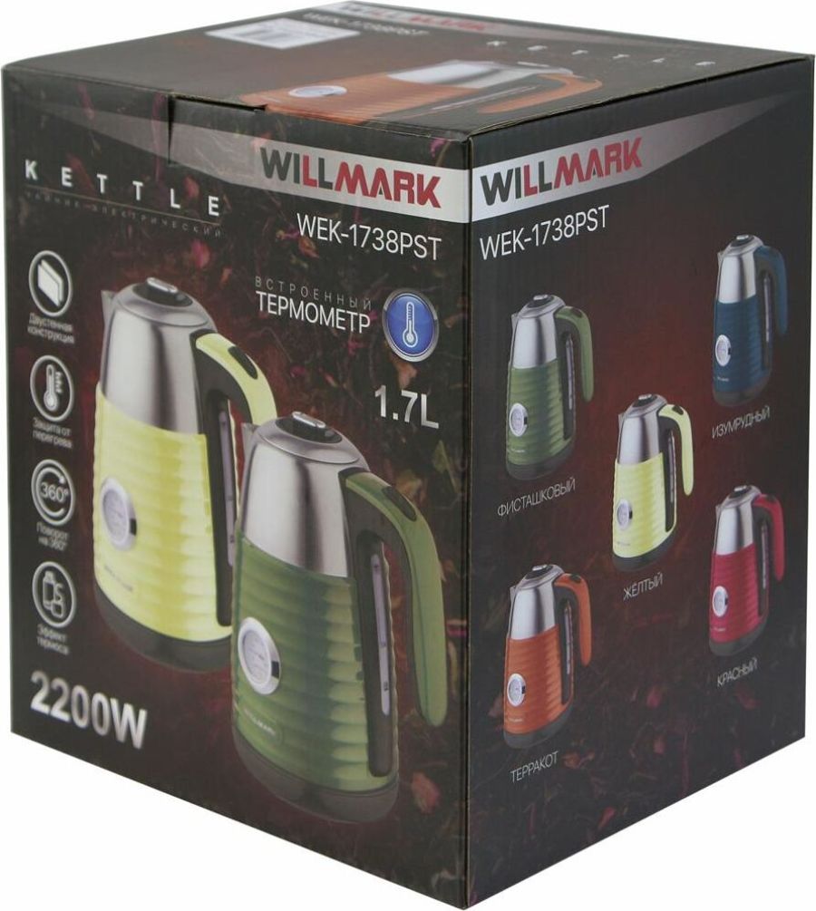 Чайник WILLMARK WEK-1738PST современный чайник с удобной ручкой, мощностью 2200Вт, объёмом 1,7 литра,с закрытым нагревательным элементом из нержавеющей стали. Удобен в эксплуатации, позволяет легко контролировать температуру воды благодаря встроенному термометру. Чайник электрический WEK-1738PST имеет двухстенную конструкцию, в которая наружняя часть выполнена из экологически безопасного пищевого пластика, внутренняя — из нержавеющей стали. Благодаря такой конструкции наружная поверхность чайника не нагревается, а при нагреве воды существенно снижается уровень шума и срок закипания. Технология термоса с двумя стенками позволит воде дольше оставаться горячей и снизит затраты на электроэнергию.