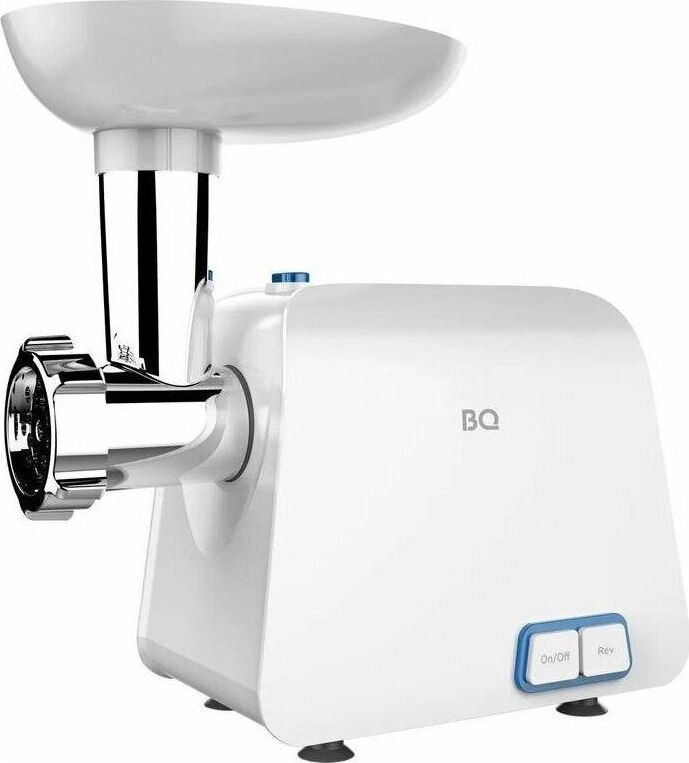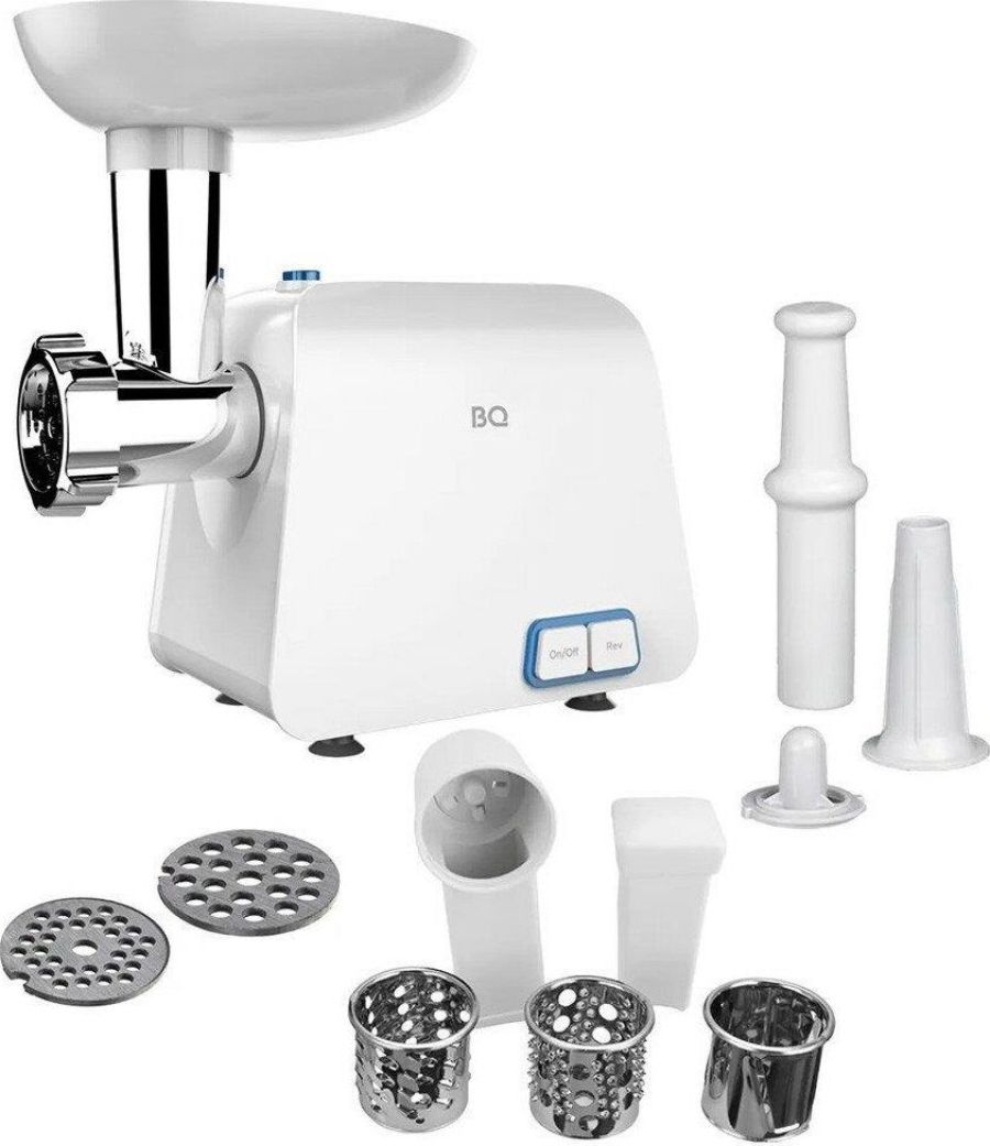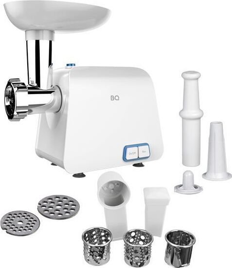 BQ MG1004 WHITE-BLUE Мощность 2100 Вт Функция реверса 2 диска для разных видов фарша (5 мм и 7 мм) Нож из нержавеющей стали Насадка для колбасок и кеббе Овощерезка с 3 барабанами Мытье в посудомоечной машине
