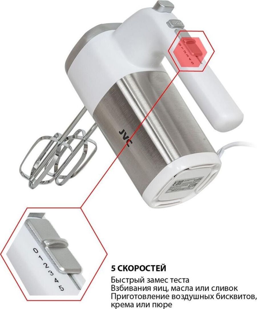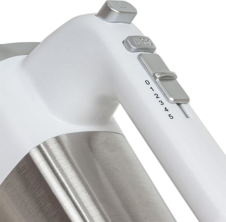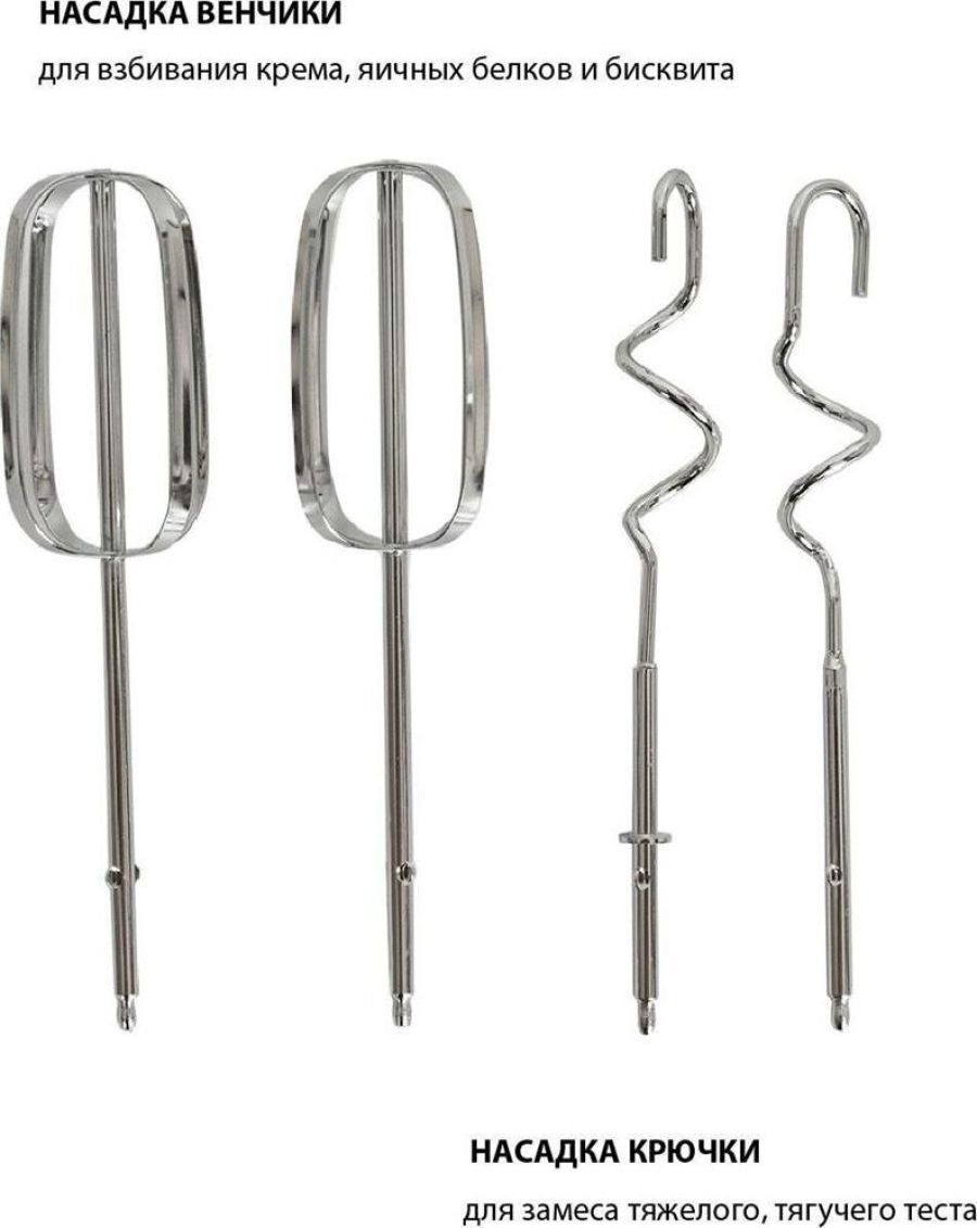 Миксер ручной, максимальная мощность: 300 Вт, 5 скоростей, переключатель скоростей, режим Турбо, венчики для взбивания яиц и крема, крючки для замеса теста, простота в использовании и чистке, эффективная система охлаждения