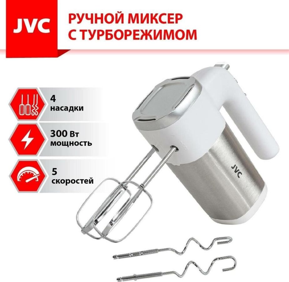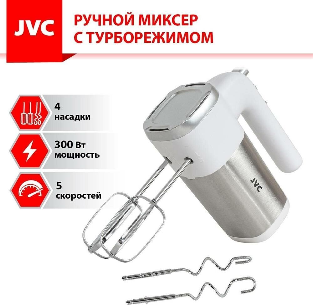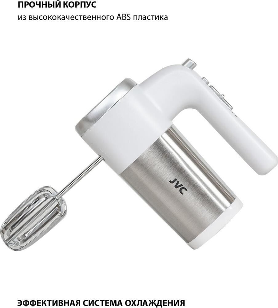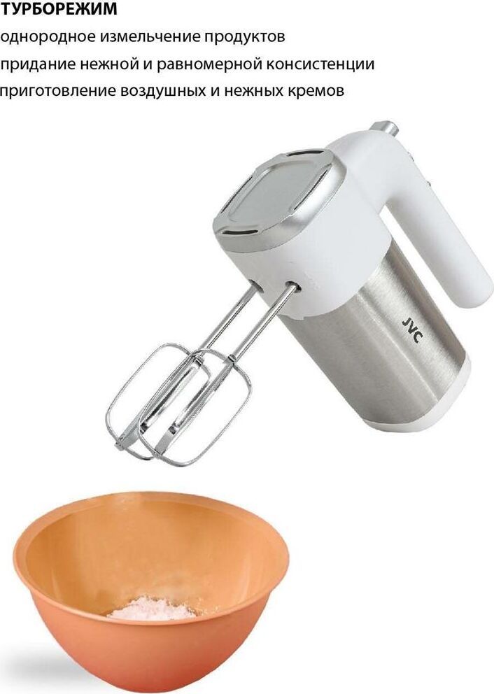 Миксер ручной, максимальная мощность: 300 Вт, 5 скоростей, переключатель скоростей, режим Турбо, венчики для взбивания яиц и крема, крючки для замеса теста, простота в использовании и чистке, эффективная система охлаждения