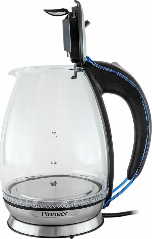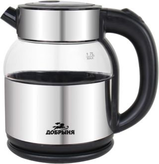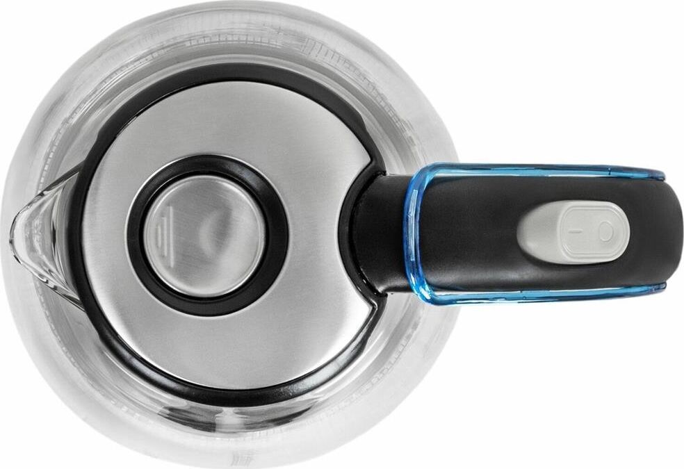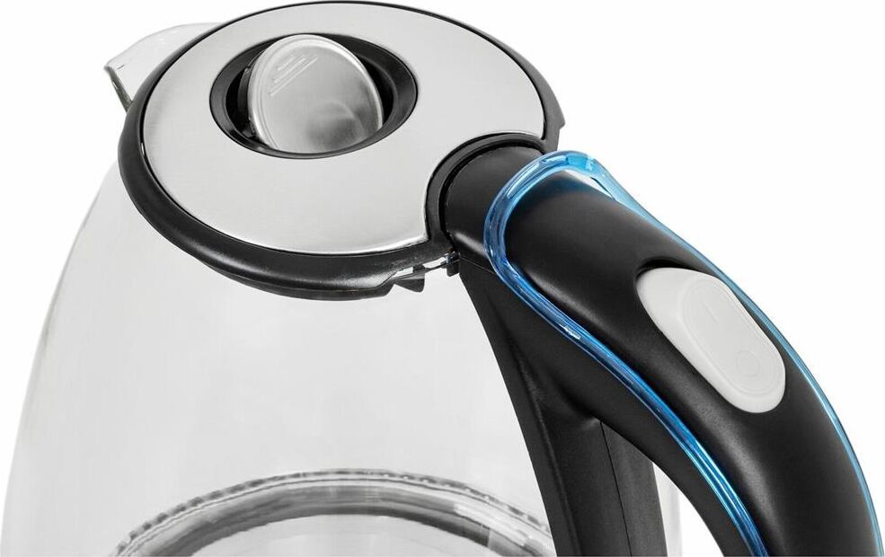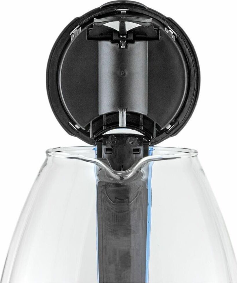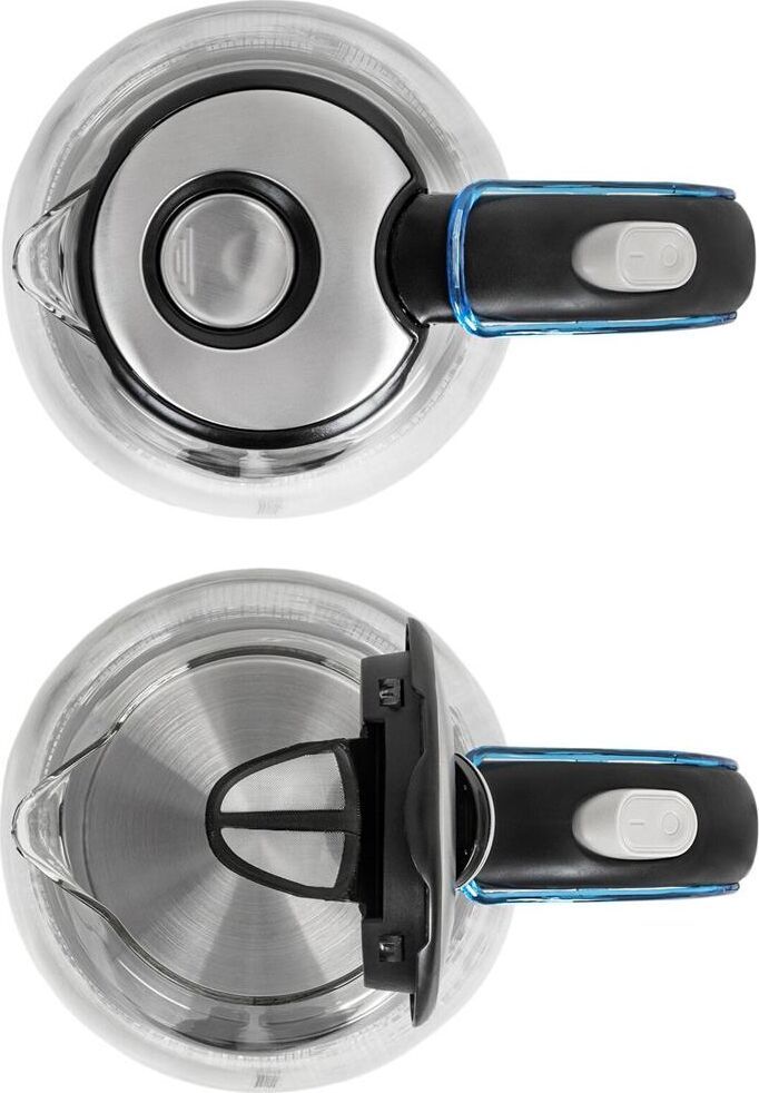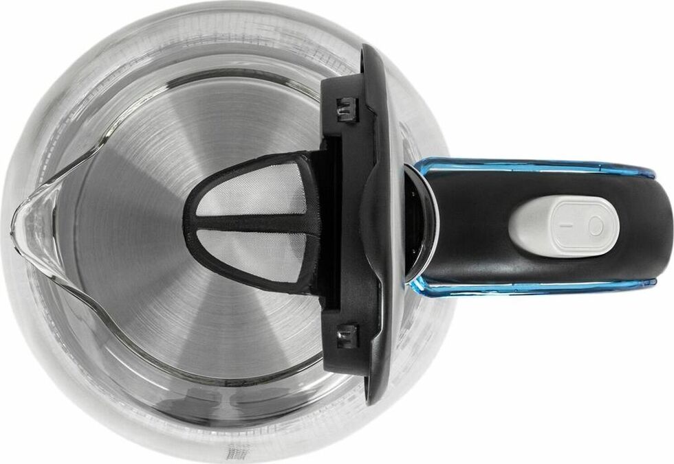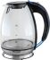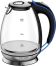 Максимальный объем, л.: 1,7 Тип нагревательного элемента: диск Подставка с вращением на 360 : есть Фильтр: съемный моющийся Отключение при закипании: есть Отключение при отсутствии воды: есть Индикатор уровня воды: есть Подсветка: есть Комплектация: чайник, гарантийный талон, инструкция на русском языке Материал корпуса: термостойкое стекло Цвет: черный с синим Максимальная потребляемая мощность, Вт.: 2200 Электропитание, в., Гц.: 220-240, 50