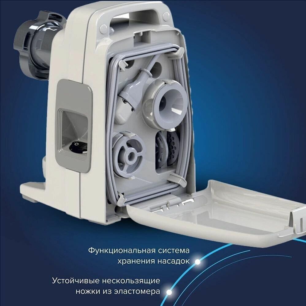Максимальная мощность - 1500 Вт Производительность – до 1,7 кг/мин. В комплекте: шнековая соковыжималка; 1 вид решеток из нержавеющей стали с отверстиями Ø 4,9 мм ; 1 запасной пластиковый колпачок Преимущества: • Малошумный двигатель • Встроенный термовыключатель • Функция «реверс» для предотвращения наматывания жилок на шнек • Удобное хранение шнура питания, ножа и насадок в отсеке с откидной крышкой • Компактный размер • Современный дизайн