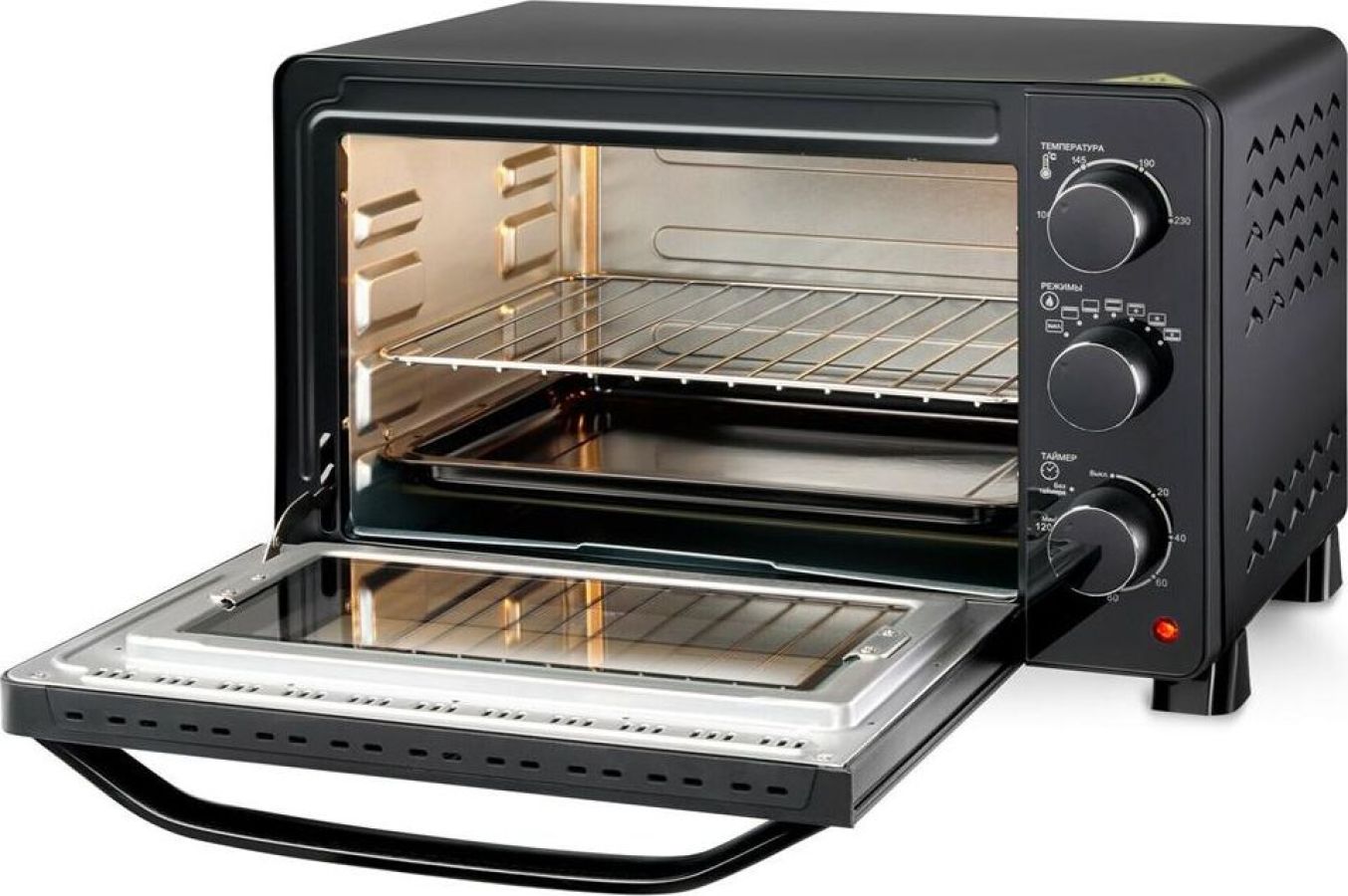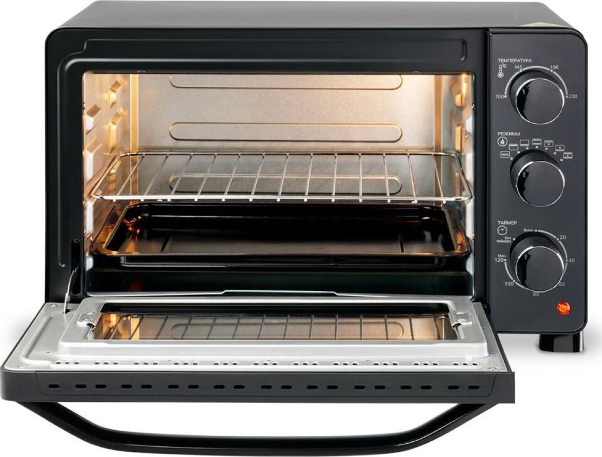 1500 ВТ, объем камеры 23 л, цвет черный, таймер на 120 мин + функция "работа без таймера", температура нагрева до 250 C, Конвекция, 6 режимов работы (верхний нагрев с конвекцией, нижний нагрев с конвекцией, одновременный верхний и нижний нагрев с конвекцией, все три режима без конвекции), Напряжение питания 230 В; Частота 50 Гц, световой индикатор, Механический тип управления, стенки нагреваются меньше чем у обычных моделей (менее 120 C), алюминиевая ручка черного цвета, ручки управления с хромированными элементами, современный дизайн HIGH END, технология изготовления HIGH TECH (преимущественно для европейского рынка 2022-2023), ножки с нескользящей опорой, внутренняя подсветка, Аксессуары: эмалированный прямоугольный противень, решетка гриль, ухват для снятия противня, поддон для сбора крошек и масла, Размеры без упаковки (см): 46,7x36,4x29 и Вес нетто без упаковки (кг): 8,1