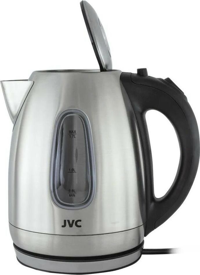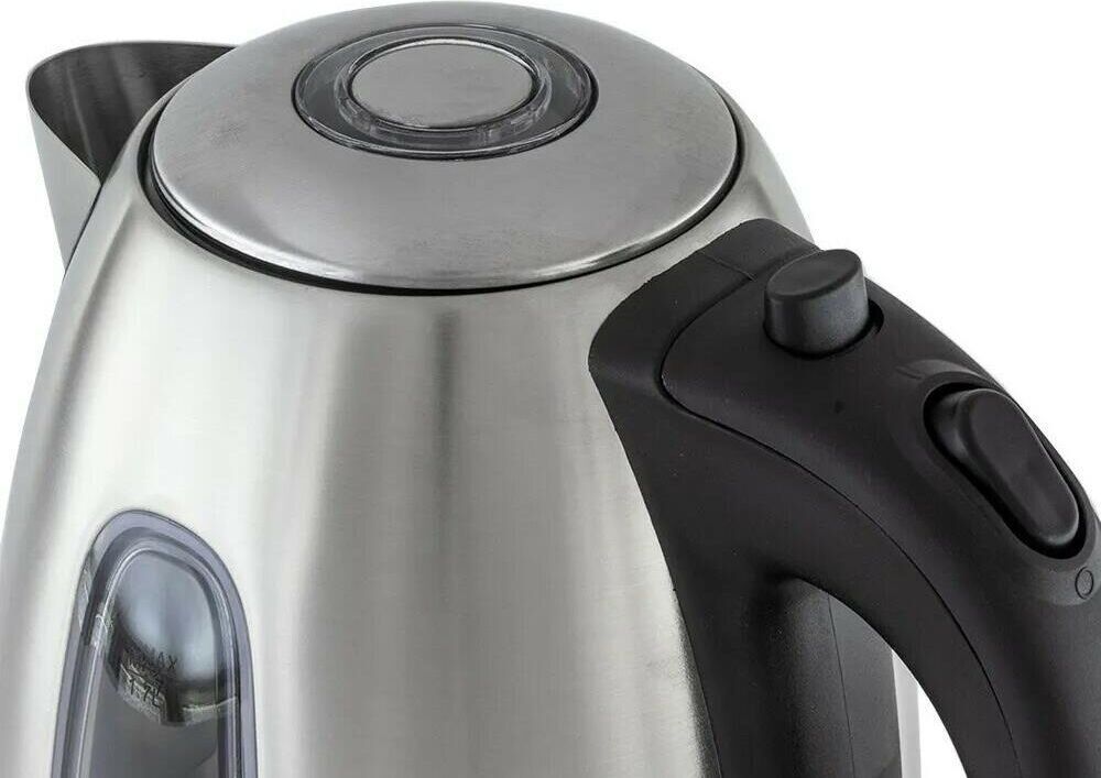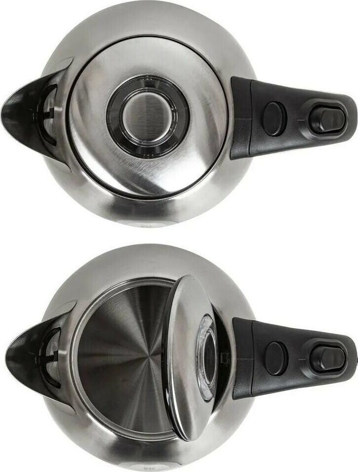Чайник электрический, объем 1,7л, максимальная мощность 2200 Вт, светодиодная подсветка, индикатор уровня воды, индикатор включения, фильтр от накипи, автоматическое открывание крышки, защита от включения без воды, автоматическое отключение при закипании, вращение на 360 градусов, хранение электрошнура в подставке, корпус из нержавеющей стали