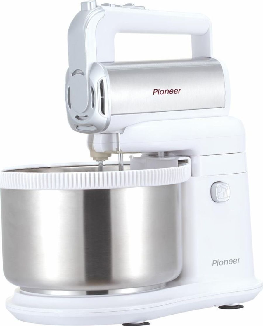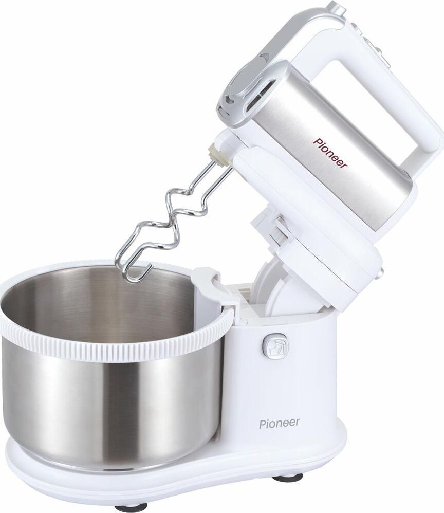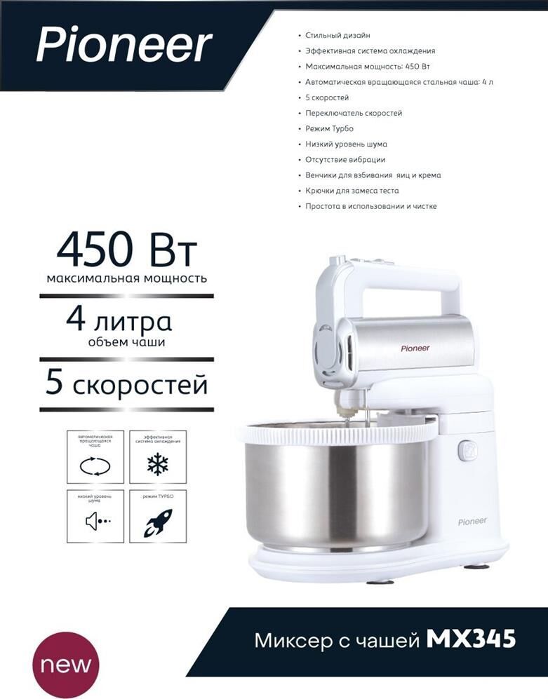 Миксер 2 в 1, ручной + стационарный, максимальная мощность 450 ватт, объем чаши 4 литра, автоматическая вращающаяся чаша, 5 скоростей, режим - Турбо, пониженный уровень шума, веньчики для взбивания яиц и крема, крючки для замеса теста